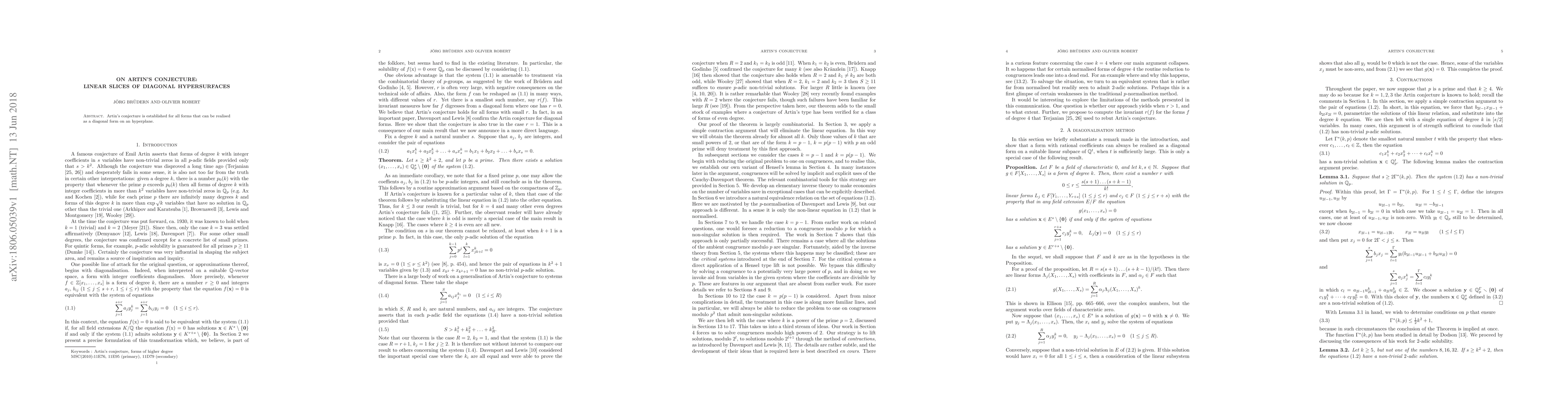 Summary: The paper confirms Artin's conjecture for diagonal hypersurfaces realized on hyperplanes, providing a comprehensive solution for these specific linear slices. This result extends the understanding of the conjecture's applicability in algebraic geometry.