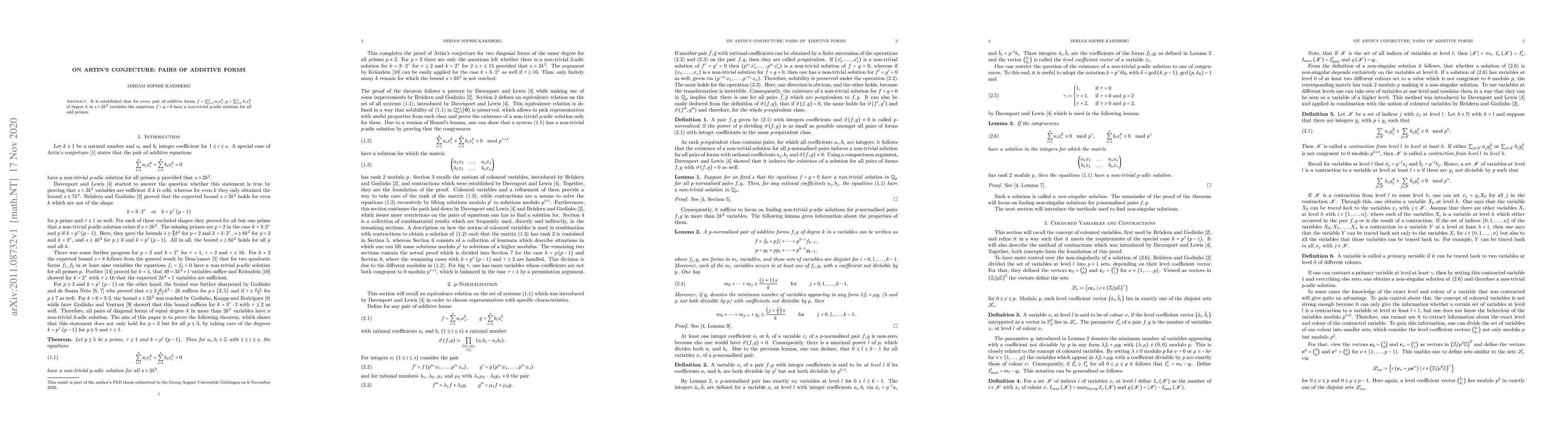 Summary: The paper proves that for any pair of additive forms in more than twice the square of their degree in variables, the simultaneous equations $f=g=0$ have non-trivial $p$-adic solutions for all odd primes $p$. This supports Artin's conjecture on the solvability of such equations.