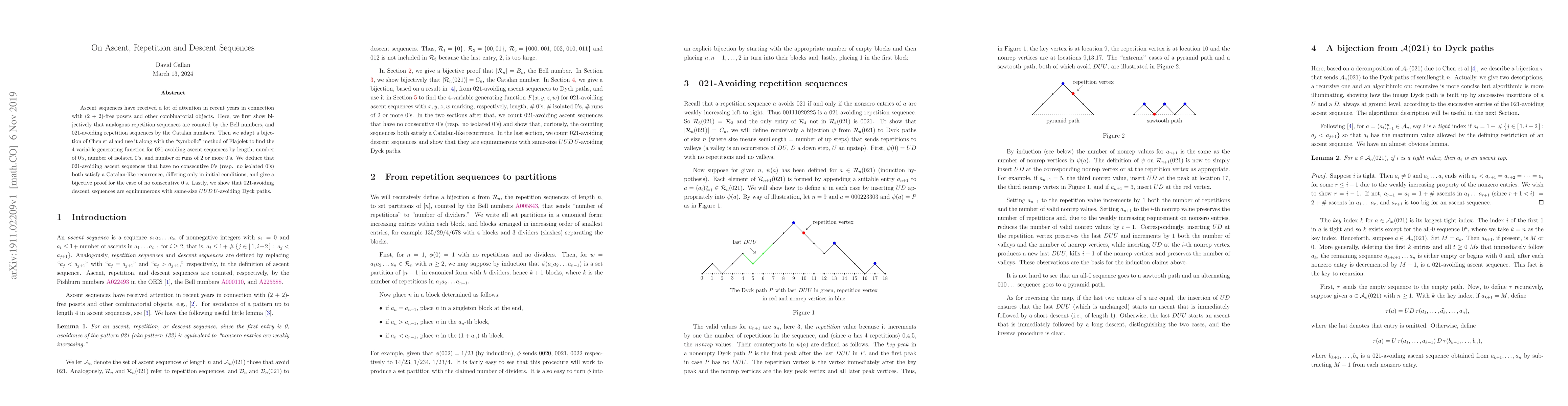 This paper establishes a bijection between repetition sequences and Bell numbers, and between 021-avoiding repetition sequences and Catalan numbers. It also derives a 4-variable generating function for 021-avoiding ascent sequences and proves a Catalan-like recurrence for specific cases. Additionally, it shows an equivalence between 021-avoiding descent sequences and $UUDU$-avoiding Dyck paths.