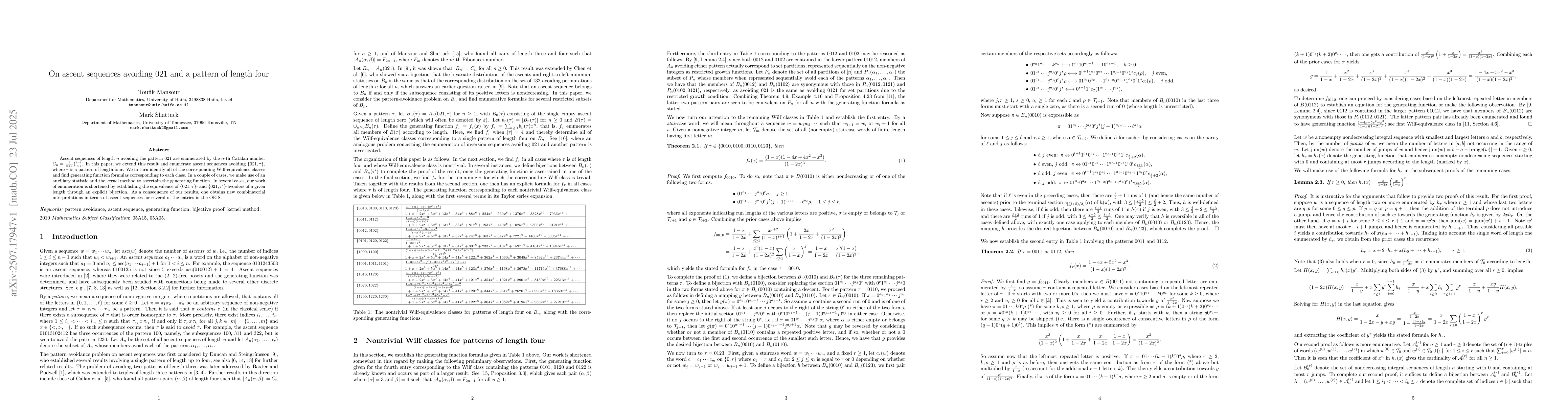 The research extends existing work on ascent sequences avoiding 021 by incorporating an additional pattern of length four, leading to new Wilf-equivalence classes and combinatorial interpretations.