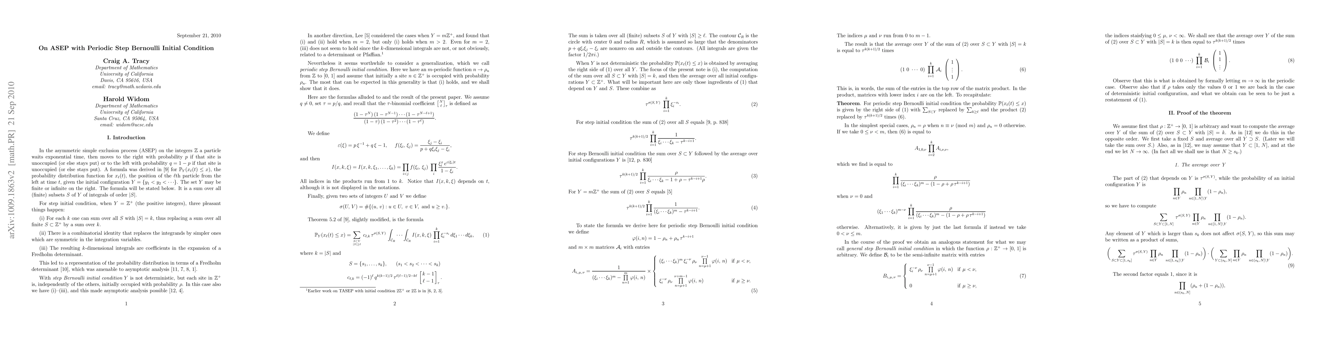 This paper studies the asymmetric simple exclusion process (ASEP) with a periodic step Bernoulli initial condition, deriving a formula for the probability distribution of a particle at any time, expressed as a sum of integrals of order k.