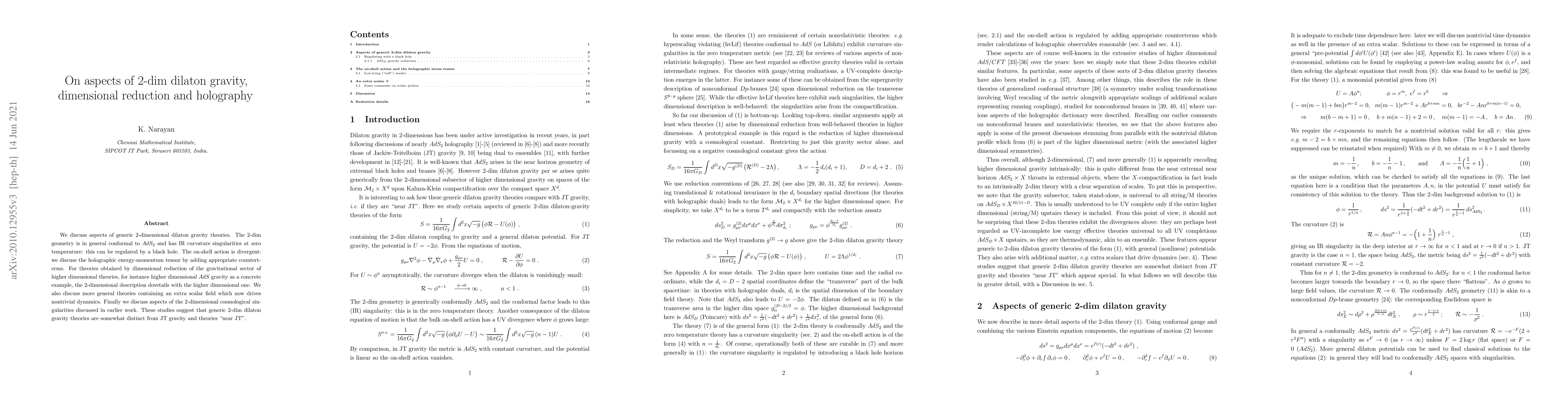 We discuss aspects of generic 2-dimensional dilaton gravity theories. The 2-dim geometry is in general conformal to $AdS_2$ and has IR curvature singularities at zero temperature: this can be regulated by a black hole. The on-shell action is divergent: we discuss the holographic energy-momentum tensor by adding appropriate counterterms. For theories obtained by dimensional reduction of the gravitational sector of higher dimensional theories, for instance higher dimensional $AdS$ gravity as a concrete example, the 2-dimensional description dovetails with the higher dimensional one. We also discuss more general theories containing an extra scalar field which now drives nontrivial dynamics. Finally we discuss aspects of the 2-dimensional cosmological singularities discussed in earlier work. These studies suggest that generic 2-dim dilaton gravity theories are somewhat distinct from JT gravity and theories "near JT".