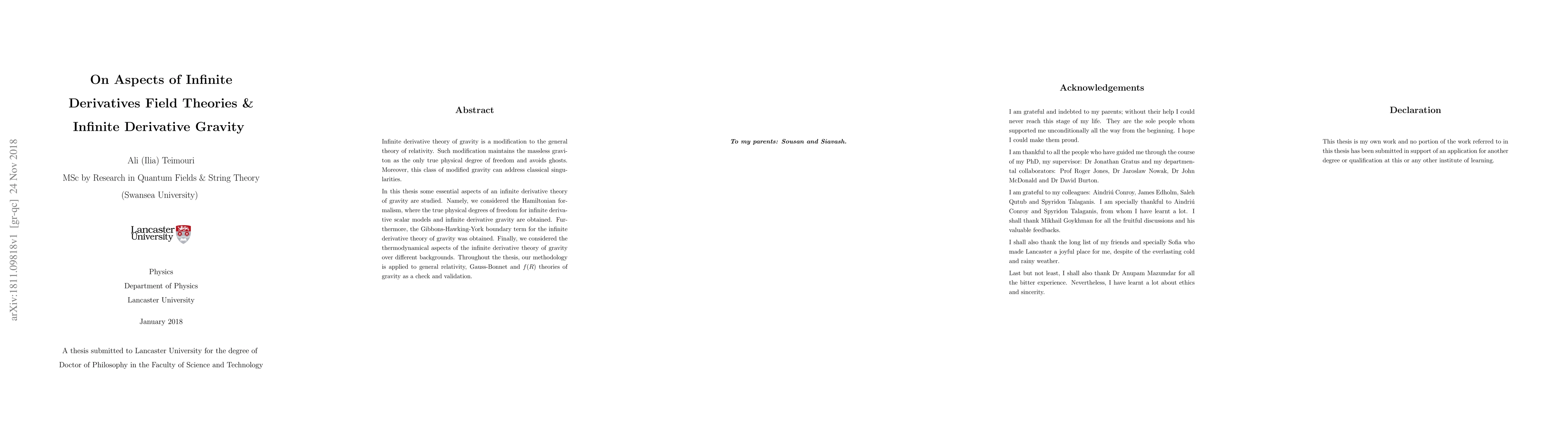 Infinite derivative theory of gravity is a modification to the general theory of relativity. Such modification maintains the massless graviton as the only true physical degree of freedom and avoids ghosts. Moreover, this class of modified gravity can address classical singularities. In this thesis some essential aspects of an infinite derivative theory of gravity are studied. Namely, we considered the Hamiltonian formalism, where the true physical degrees of freedom for infinite derivative scalar models and infinite derivative gravity are obtained. Furthermore, the Gibbons-Hawking-York boundary term for the infinite derivative theory of gravity was obtained. Finally, we considered the thermodynamical aspects of the infinite derivative theory of gravity over different backgrounds. Throughout the thesis, our methodology is applied to general relativity, Gauss-Bonnet and f(R) theories of gravity as a check and validation.