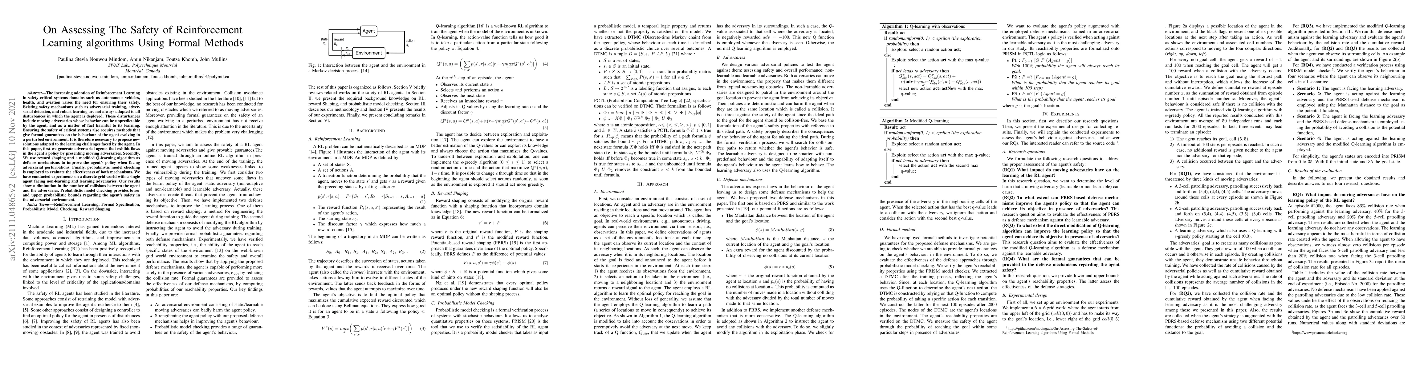 The increasing adoption of Reinforcement Learning in safety-critical systems domains such as autonomous vehicles, health, and aviation raises the need for ensuring their safety. Existing safety mechanisms such as adversarial training, adversarial detection, and robust learning are not always adapted to all disturbances in which the agent is deployed. Those disturbances include moving adversaries whose behavior can be unpredictable by the agent, and as a matter of fact harmful to its learning. Ensuring the safety of critical systems also requires methods that give formal guarantees on the behaviour of the agent evolving in a perturbed environment. It is therefore necessary to propose new solutions adapted to the learning challenges faced by the agent. In this paper, first we generate adversarial agents that exhibit flaws in the agent's policy by presenting moving adversaries. Secondly, We use reward shaping and a modified Q-learning algorithm as defense mechanisms to improve the agent's policy when facing adversarial perturbations. Finally, probabilistic model checking is employed to evaluate the effectiveness of both mechanisms. We have conducted experiments on a discrete grid world with a single agent facing non-learning and learning adversaries. Our results show a diminution in the number of collisions between the agent and the adversaries. Probabilistic model checking provides lower and upper probabilistic bounds regarding the agent's safety in the adversarial environment.