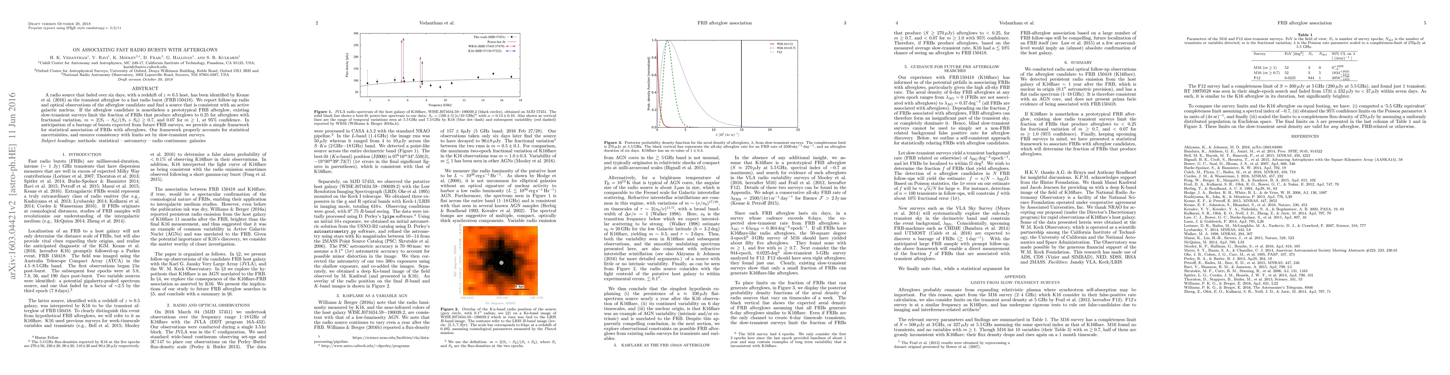 Keane et al. (2016) identified a fading radio source as the afterglow of FRB 150418, but follow-up observations suggest it may be an active galactic nucleus instead. The study estimates that only a small fraction of FRBs produce detectable afterglows, providing a statistical framework for future FRB-afterglow associations.
