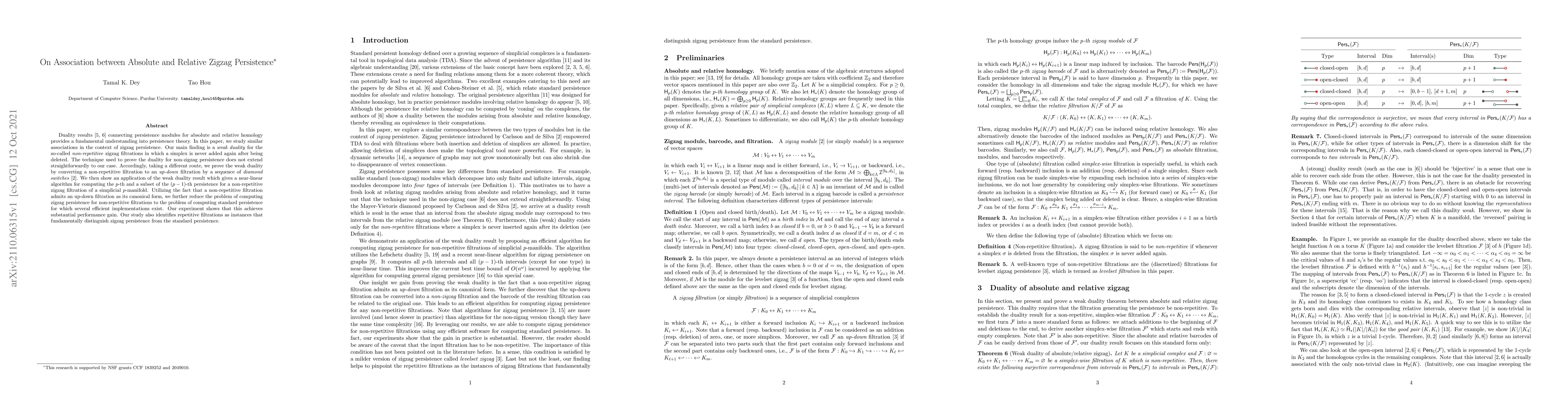 Duality results connecting persistence modules for absolute and relative homology provides a fundamental understanding into persistence theory. In this paper, we study similar associations in the context of zigzag persistence. Our main finding is a weak duality for the so-called non-repetitive zigzag filtrations in which a simplex is never added again after being deleted. The technique used to prove the duality for non-zigzag persistence does not extend straightforwardly to our case. Accordingly, taking a different route, we prove the weak duality by converting a non-repetitive filtration to an up-down filtration by a sequence of diamond switches. We then show an application of the weak duality result which gives a near-linear algorithm for computing the $p$-th and a subset of the $(p-1)$-th persistence for a non-repetitive zigzag filtration of a simplicial $p$-manifold. Utilizing the fact that a non-repetitive filtration admits an up-down filtration as its canonical form, we further reduce the problem of computing zigzag persistence for non-repetitive filtrations to the problem of computing standard persistence for which several efficient implementations exist. Our experiment shows that this achieves substantial performance gain. Our study also identifies repetitive filtrations as instances that fundamentally distinguish zigzag persistence from the standard persistence.