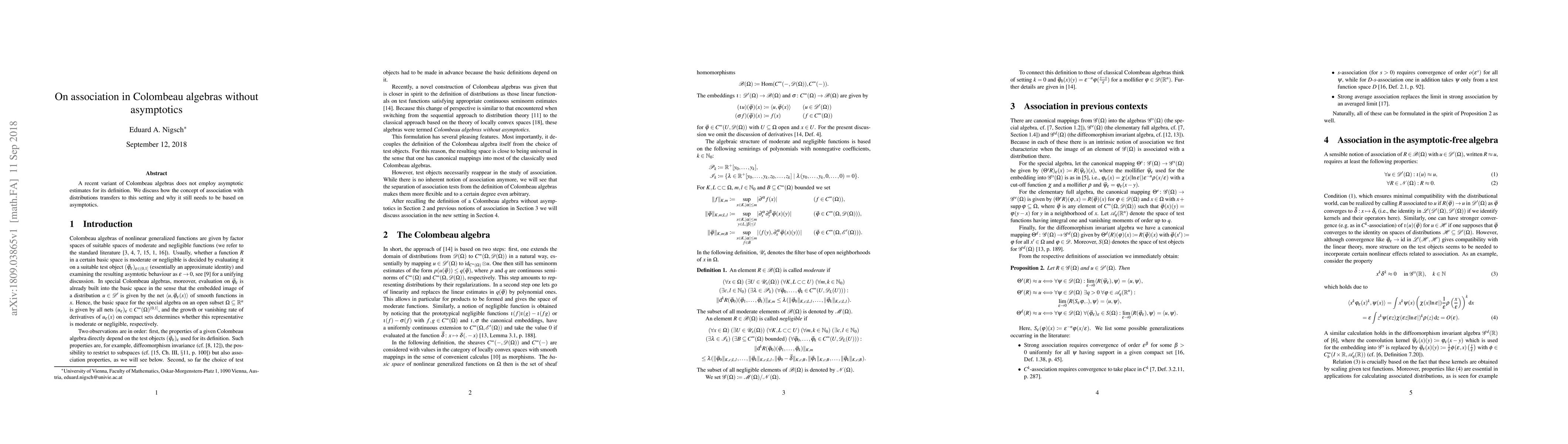 Summary: This paper examines Colombeau algebras defined without asymptotic estimates and explores the transfer of the association concept with distributions, highlighting that despite the new definition, the association still inherently relies on asymptotics.