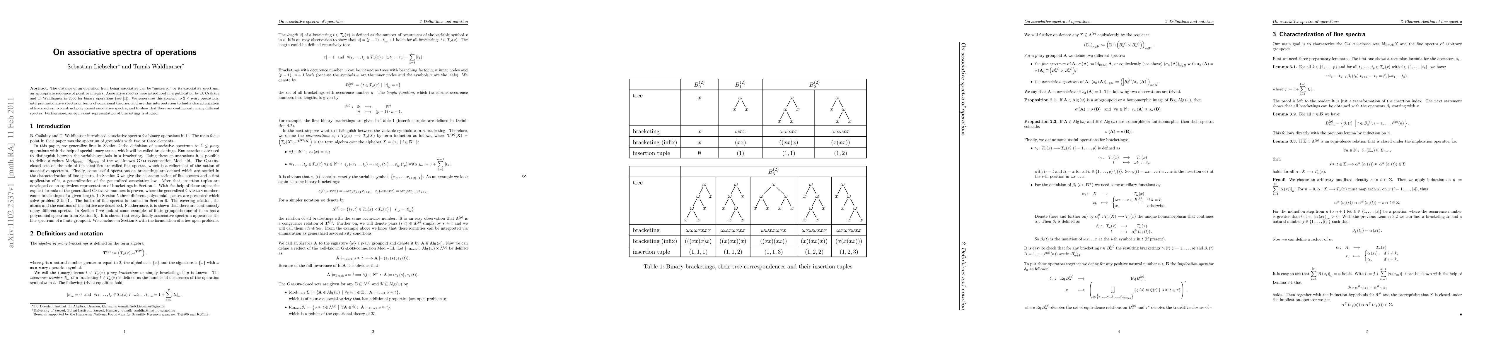 The distance of an operation from being associative can be "measured" by its associative spectrum, an appropriate sequence of positive integers. Associative spectra were introduced in a publication by B. Cs\'ak\'any and T. Waldhauser in 2000 for binary operations (see arXiv:1102.2124). We generalize this concept to p-ary operations, interpret associative spectra in terms of equational theories, and use this interpretation to find a characterization of fine spectra, to construct polynomial associative spectra, and to show that there are continuously many different spectra. Furthermore, an equivalent representation of bracketings is studied.