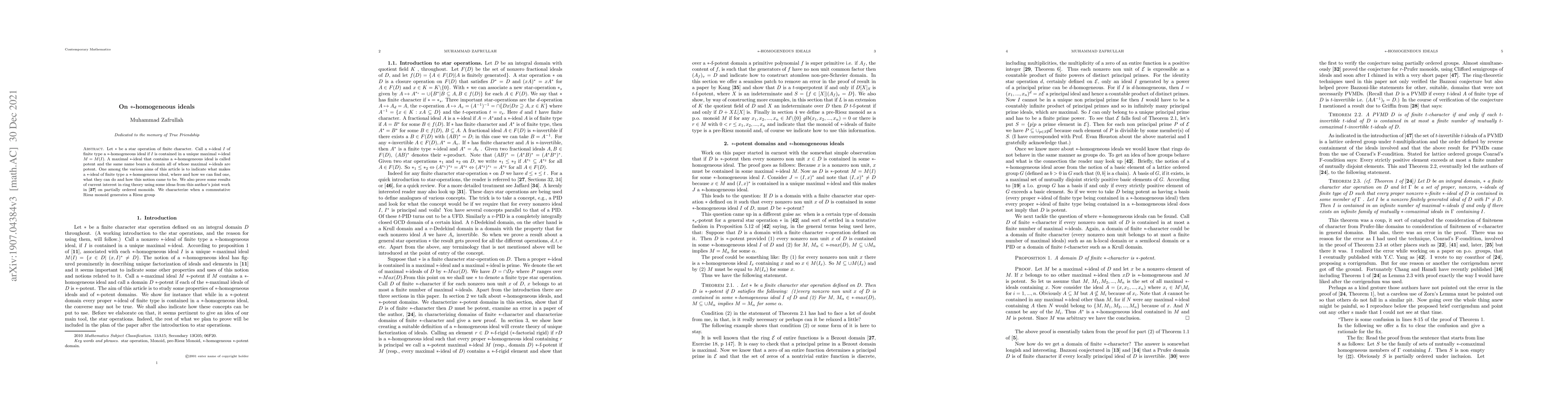 Let $\ast $ be a star operation of finite character. Call a $\ast $-ideal $I$ of finite type a $\ast $-homogeneous ideal if $I$ is contained in a unique maximal $\ast $-ideal $M=M(I).$ A maximal $\ast $-ideal that contains a $\ast $-homogeneous ideal is called $\ast $-potent and the same name bears a domain all of whose maximal $\ast $-ideals are $\ast $-potent. One among the various aims of this article is to indicate what makes a $\ast $-ideal of finite type a $\ast $-homogeneous ideal, where and how we can find one, what they can do and how this notion came to be. We also prove some results of current interest in ring theory using some ideas from this author's joint work in \cite{LYZ 2014} on partially ordered monoids. For example we characterize when a commutative Riesz monoid generates a Riesz group.