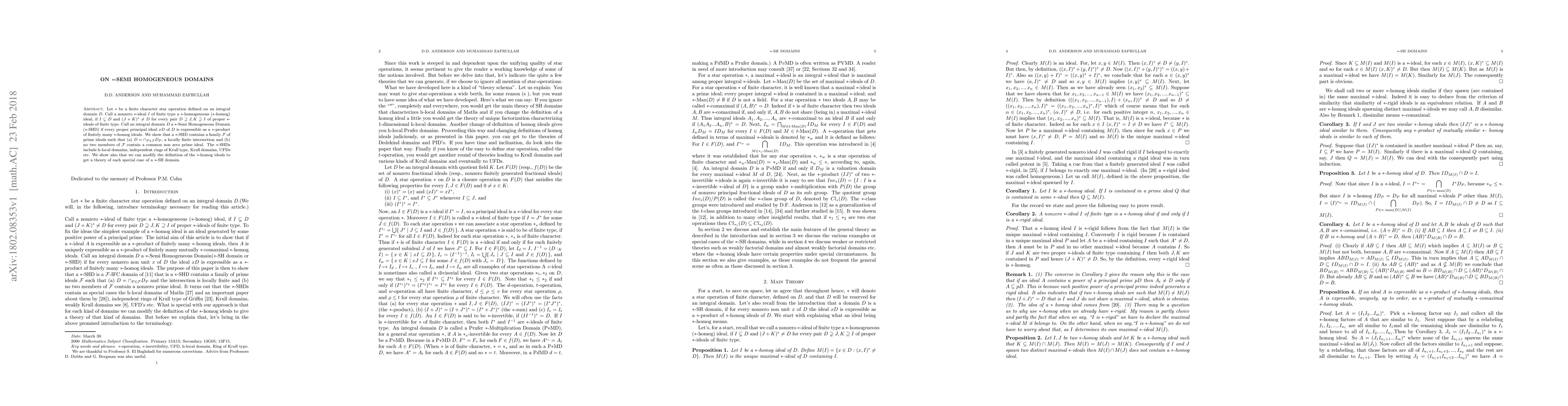 Let $\ast $ be a finite character star operation defined on an integral domain $D.$ Call a nonzero $\ast $-ideal $I$ of finite type a $\ast $ -homogeneous ($\ast $-homog) ideal, if $I\subsetneq D$ and $(J+K)^{\ast }\neq D$ for every pair $D\supsetneq J,K\supseteq I$ of proper $\ast $ -ideals of finite type$.$ Call an integral domain $D$ a $\ast $-Semi Homogeneous Domain ($\ast $-SHD) if every proper principal ideal $xD$ of $D$ is expressible as a $\ast $-product of finitely many $\ast $-homog ideals. We show that a $\ast $-SHD contains a family $\mathcal{F}$ of prime ideals such that (a) $D=\cap_{P\in \mathcal{F}}D_{P},$ a locally finite intersection and (b) no two members of $\mathcal{F}$ contain a common non zero prime ideal. The $\ast $-SHDs include h-local domains, independent rings of Krull type, Krull domains, UFDs etc. We show also that we can modify the definition of the $\ast $-homog ideals to get a theory of each special case of a $\ast $-SH domain.