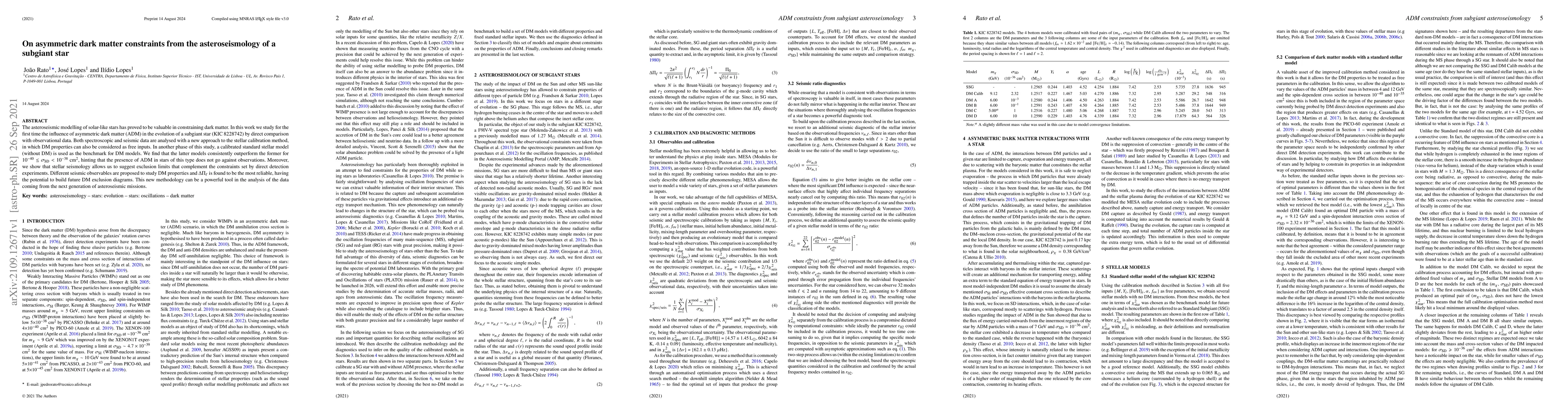 The asteroseismic modelling of solar-like stars has proved to be valuable in constraining dark matter. In this work we study for the first time the influence of asymmetric dark matter (ADM) in the evolution of a subgiant star (KIC 8228742) by direct comparison with observational data. Both spectroscopic and seismic data are analysed with a new approach to the stellar calibration method, in which DM properties can also be considered as free inputs. In another phase of this study, a calibrated standard stellar model (without DM) is used as the benchmark for DM models. We find that the latter models consistently outperform the former for $10^{-40} \leq \sigma_\mathrm{SD} < 10^{-38}$ cm$^2$, hinting that the presence of ADM in stars of this type does not go against observations. Moreover, we show that stellar seismology allows us to suggest exclusion limits that complement the constraints set by direct detection experiments. Different seismic observables are proposed to study DM properties and $\Delta\Pi_\ell$ is found to be the most reliable, having the potential to build future DM exclusion diagrams. This new methodology can be a powerful tool in the analysis of the data coming from the next generation of asteroseismic missions.