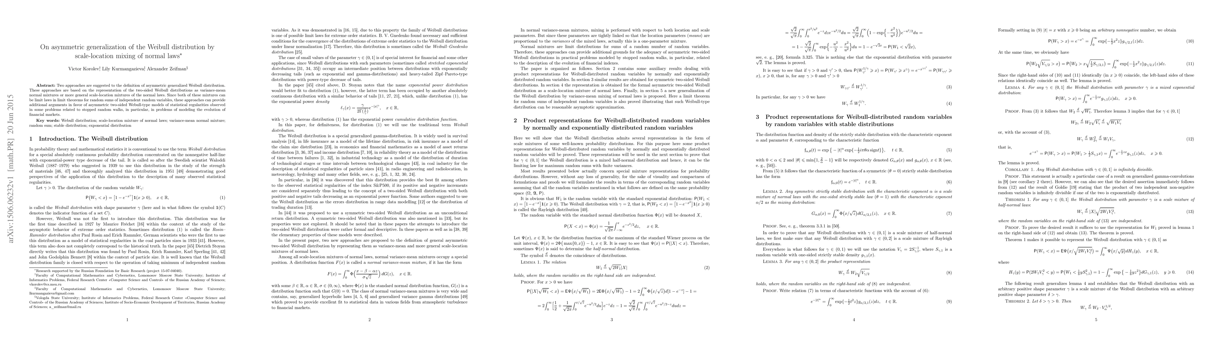 Two approaches are suggested to the definition of asymmetric generalized Weibull distribution. These approaches are based on the representation of the two-sided Weibull distributions as variance-mean normal mixtures or more general scale-location mixtures of the normal laws. Since both of these mixtures can be limit laws in limit theorems for random sums of independent random variables, these approaches can provide additional arguments in favor of asymmetric two-sided Weibull-type models of statistical regularities observed in some problems related to stopped random walks, in particular, in problems of modeling the evolution of financial markets.