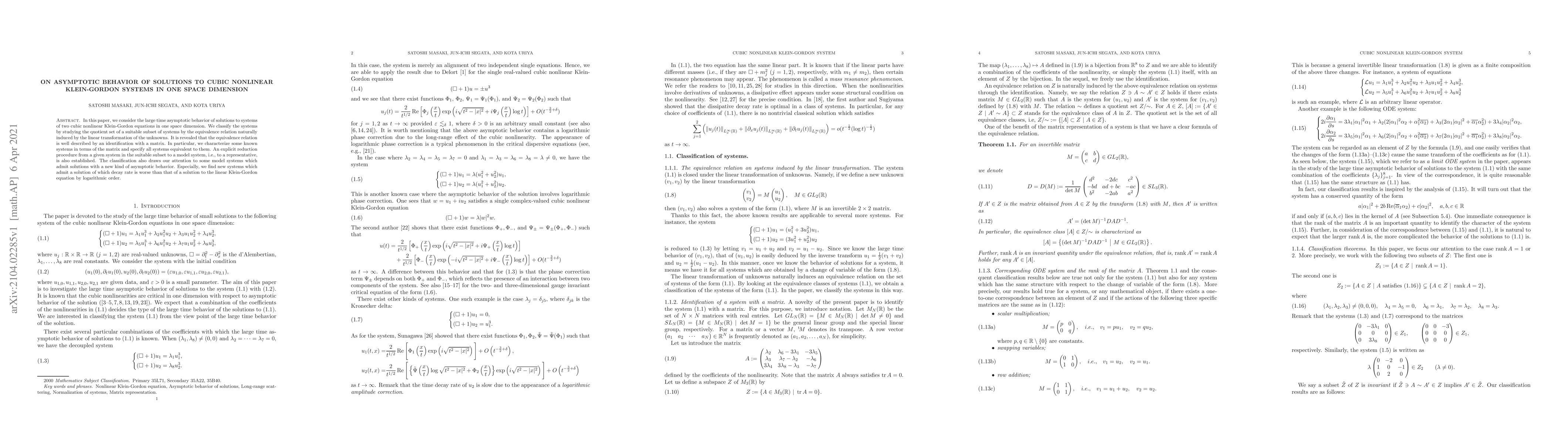 This paper studies the asymptotic behavior of solutions to cubic nonlinear Klein-Gordon systems in one dimension, classifying them via a matrix-based equivalence relation and identifying new systems with unique decay rates, including some with logarithmically worse decay than linear Klein-Gordon solutions.