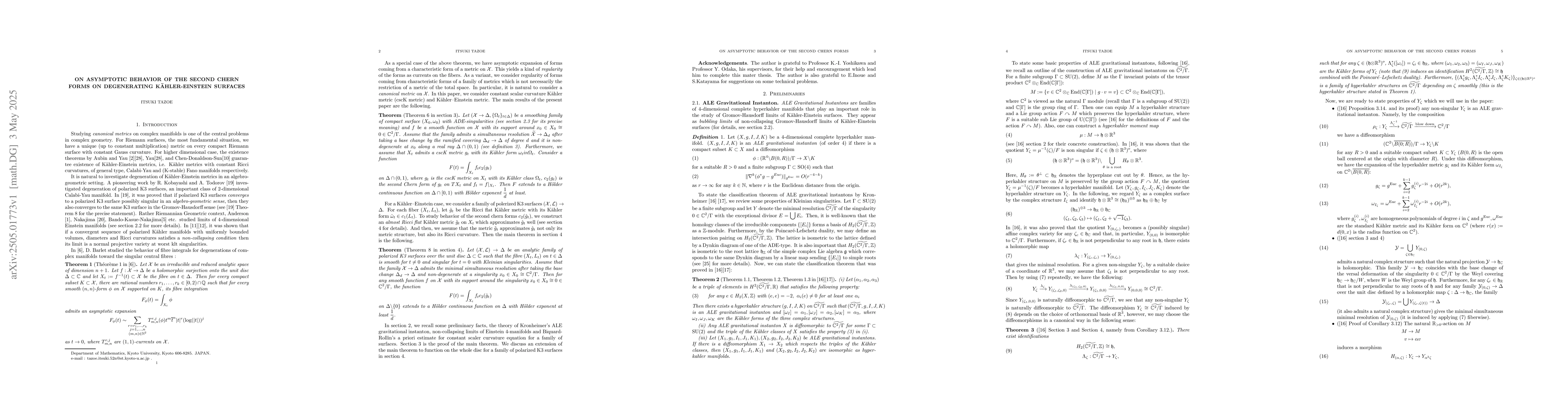 The paper studies the asymptotic behavior of the second Chern forms on degenerating Kähler-Einstein surfaces, focusing on a function defined by fiber integrals with a smooth test function on the family and analyzing its Hölder exponent at the origin.