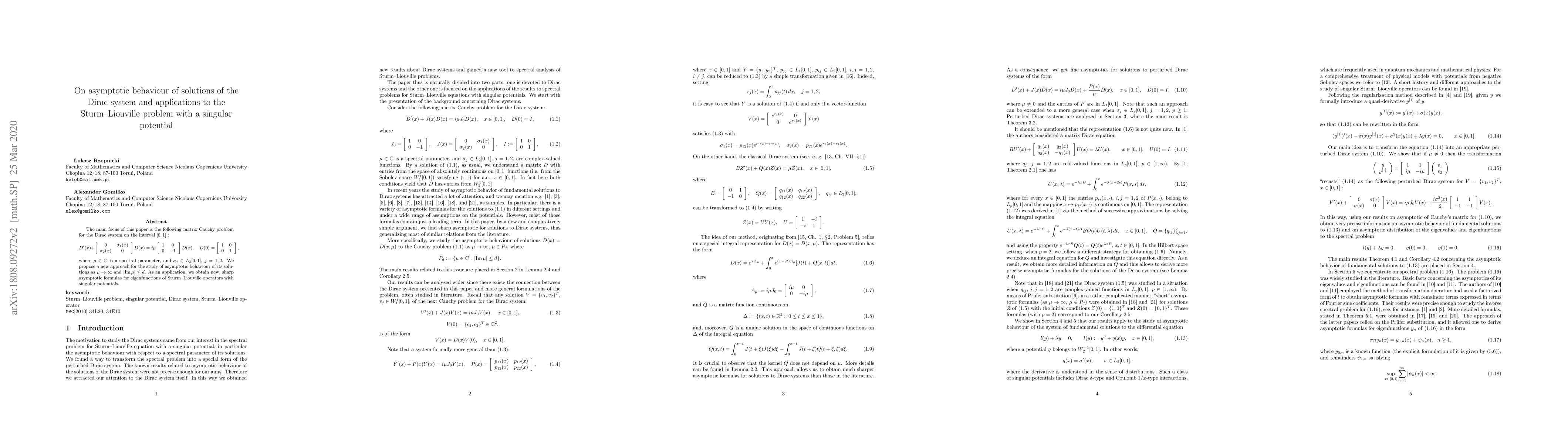 The main focus of this paper is the following matrix Cauchy problem for the Dirac system on the interval $[0,1]:$ \[ D'(x)+\left[\begin{array}{cc} 0 & \sigma_1(x)\\ \sigma_2(x) & 0 \end{array} \right] D(x)=i\mu\left[\begin{array}{cc} 1 & 0\\ 0 &-1 \end{array} \right]D(x),\quad D(0)=\left[\begin{array}{cc} 1 & 0\\ 0 & 1 \end{array}\right], \] where $\mu\in\mathbb{C}$ is a spectral parameter, and $\sigma_j\in L_2[0,1]$, $j=1,2$. We propose a new approach for the study of asymptotic behaviour of its solutions as $\mu\to \infty$ and $|{\rm Im}\,\mu|\le d$. As an application, we obtain new, sharp asymptotic formulas for eigenfunctions of Sturm-Liouville operators with singular potentials.