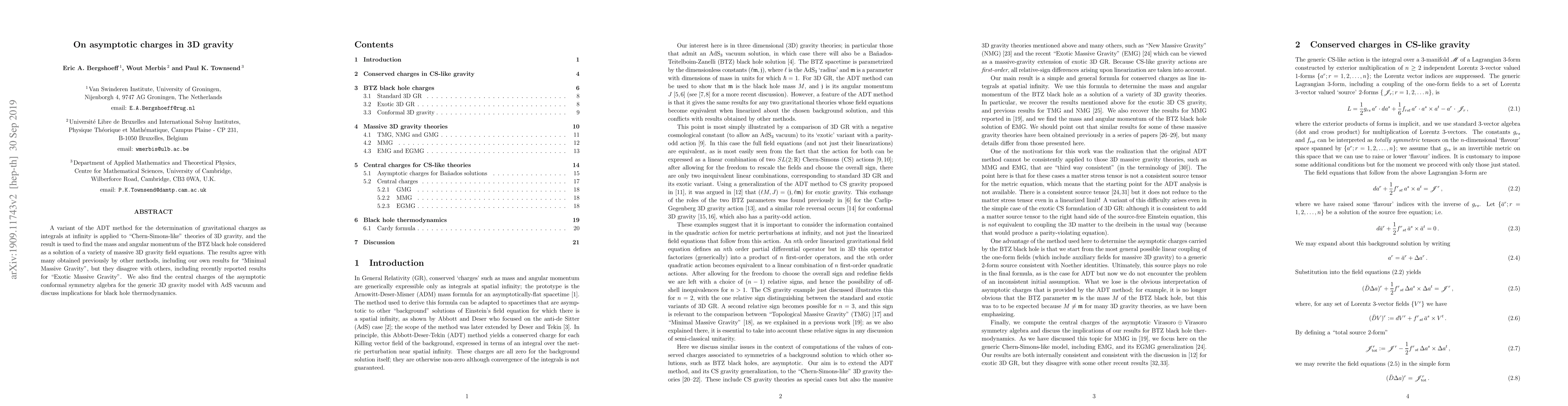 This paper applies the ADT method to determine gravitational charges in 3D gravity, finding the mass and angular momentum of BTZ black holes, which agree with previous results but not with recent findings for "Exotic Massive Gravity". It also discusses the central charges of the asymptotic conformal symmetry algebra and its implications for black hole thermodynamics.