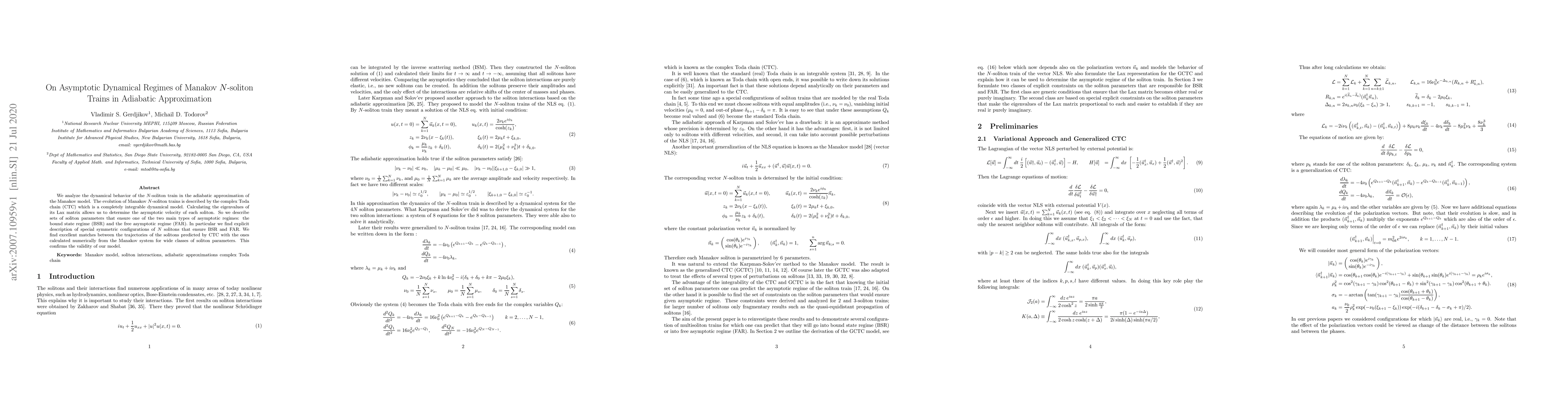 This paper investigates the asymptotic dynamical regimes of $N$-soliton trains in the Manakov model under adiabatic approximation, identifying conditions for bound state and free asymptotic regimes. The complex Toda chain describes the soliton evolution, and the study confirms the model's validity through numerical comparisons.
