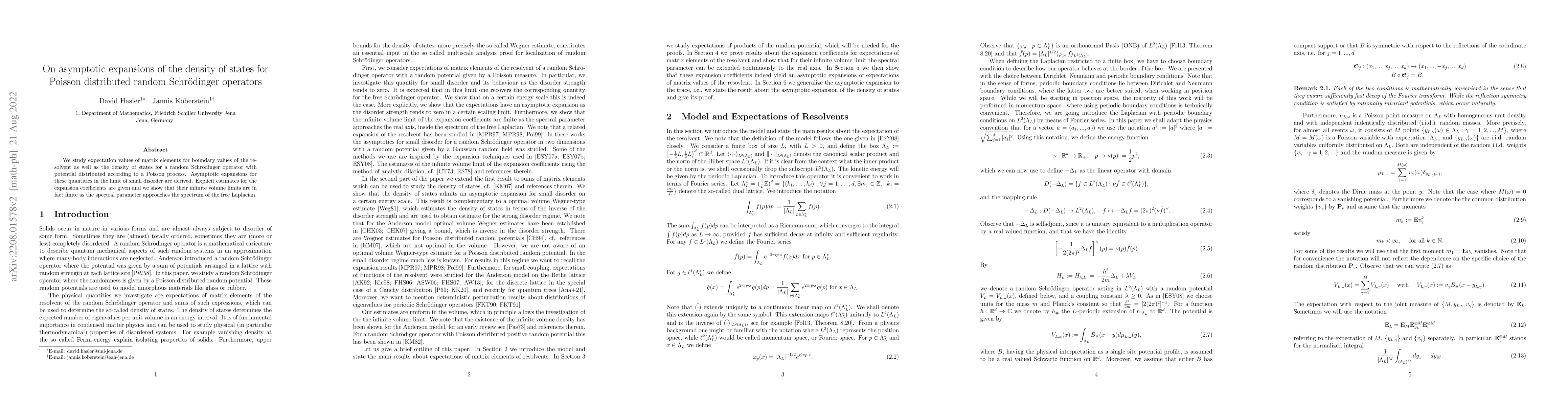 This paper derives asymptotic expansions for the density of states and resolvent matrix elements of a random Schrödinger operator with a Poisson-distributed potential, demonstrating finite limits for these expansions as disorder diminishes and the spectral parameter nears the free Laplacian spectrum. Explicit estimates for the expansion coefficients are provided.