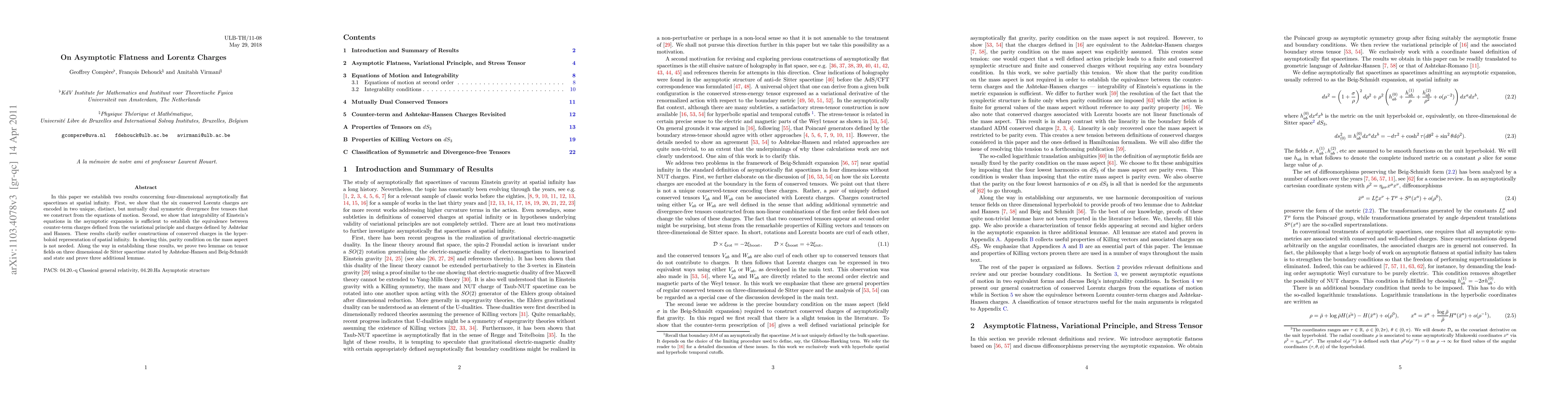 In this paper we establish two results concerning four-dimensional asymptotically flat spacetimes at spatial infinity. First, we show that the six conserved Lorentz charges are encoded in two unique, distinct, but mutually dual symmetric divergence free tensors that we construct from the equations of motion. Second, we show that integrability of Einstein's equations in the asymptotic expansion is sufficient to establish the equivalence between counter-term charges defined from the variational principle and charges defined by Ashtekar and Hansen. These results clarify earlier constructions of conserved charges in the hyperboloid representation of spatial infinity. In showing this, parity condition on the mass aspect is not needed. Along the way in establishing these results, we prove two lemmae on tensor fields on three dimensional de Sitter spacetime stated by Ashtekar-Hansen and Beig-Schmidt and state and prove three additional lemmae.