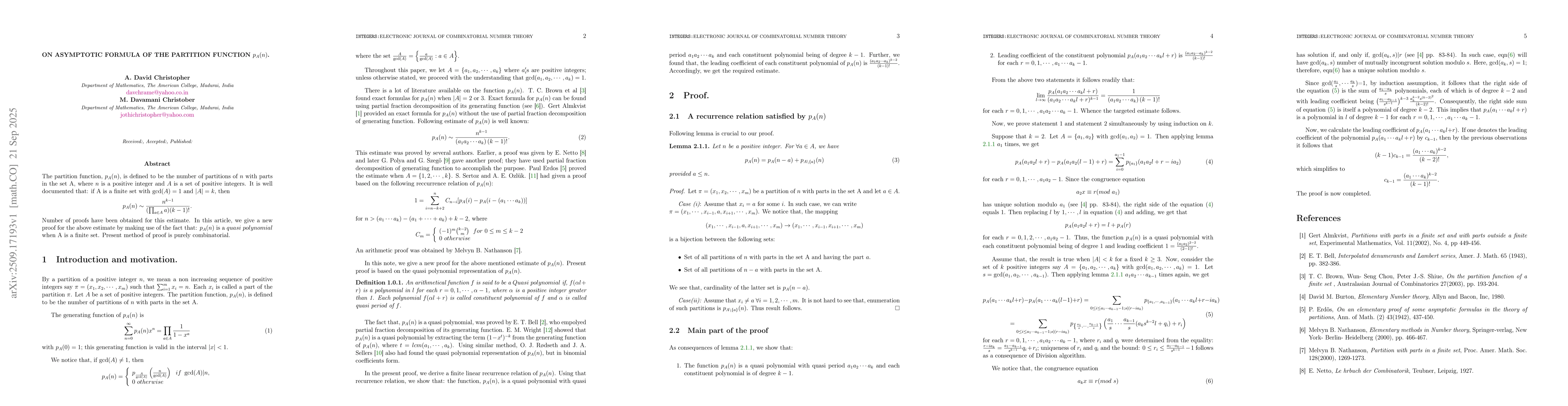 The paper presents a novel combinatorial proof of the asymptotic formula for $p_A(n)$, utilizing the quasi-polynomial representation and a derived recurrence relation to establish the leading coefficient and asymptotic behavior.