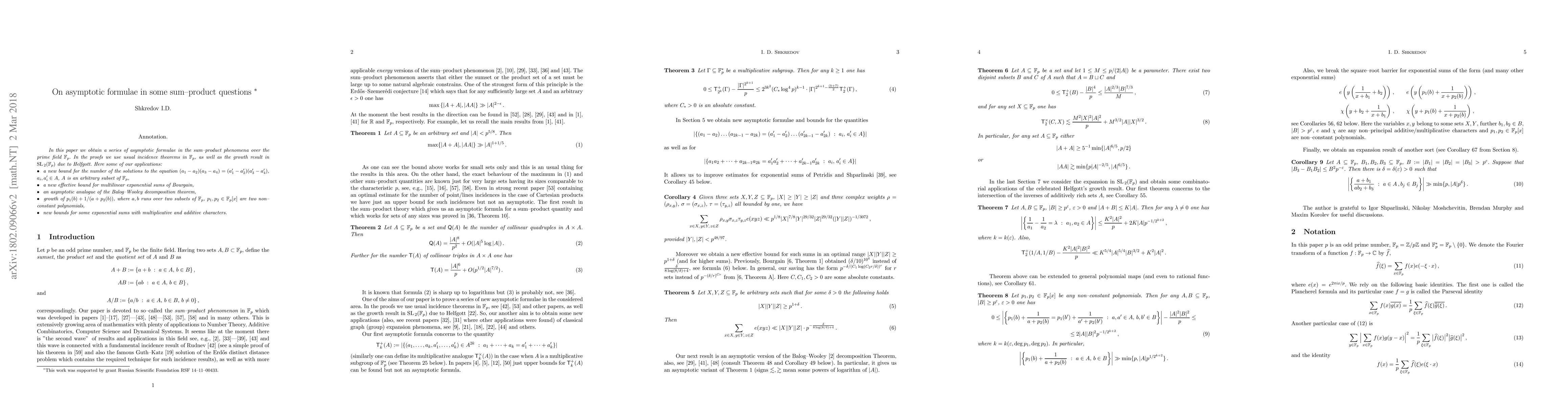 In this paper we obtain a series of asymptotic formulae in the sum--product phenomena over the prime field $\mathbf{F}_p$. In the proofs we use usual incidence theorems in $\mathbf{F}_p$, as well as the growth result in ${\rm SL}_2 (\mathbf{F}_p)$ due to Helfgott. Here some of our applications: $\bullet~$ a new bound for the number of the solutions to the equation $(a_1-a_2) (a_3-a_4) = (a'_1-a'_2) (a'_3-a'_4)$, $\,a_i, a'_i\in A$, $A$ is an arbitrary subset of $\mathbf{F}_p$, $\bullet~$ a new effective bound for multilinear exponential sums of Bourgain, $\bullet~$ an asymptotic analogue of the Balog--Wooley decomposition theorem, $\bullet~$ growth of $p_1(b) + 1/(a+p_2 (b))$, where $a,b$ runs over two subsets of $\mathbf{F}_p$, $p_1,p_2 \in \mathbf{F}_p [x]$ are two non--constant polynomials, $\bullet~$ new bounds for some exponential sums with multiplicative and additive characters.