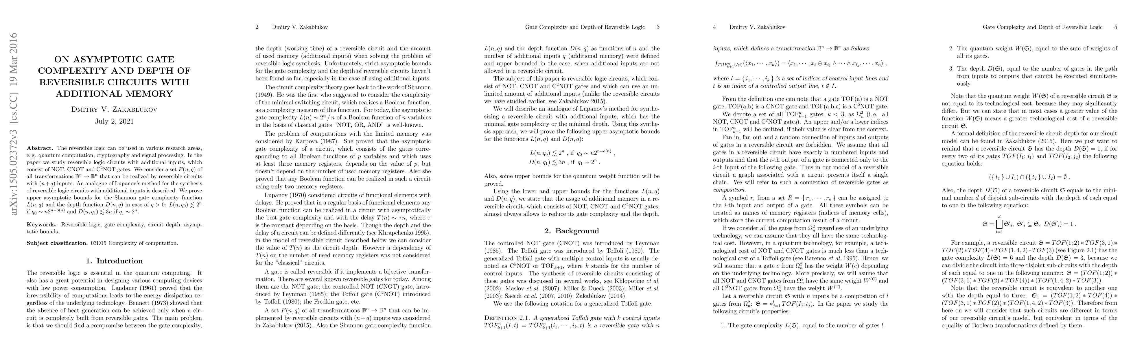 This paper investigates the asymptotic gate complexity and depth of reversible logic circuits with additional memory inputs. It establishes upper bounds for the Shannon gate complexity and depth functions, showing that $L(n,q) \lesssim 2^n$ and $D(n,q) \lesssim 3n$ under specific conditions.