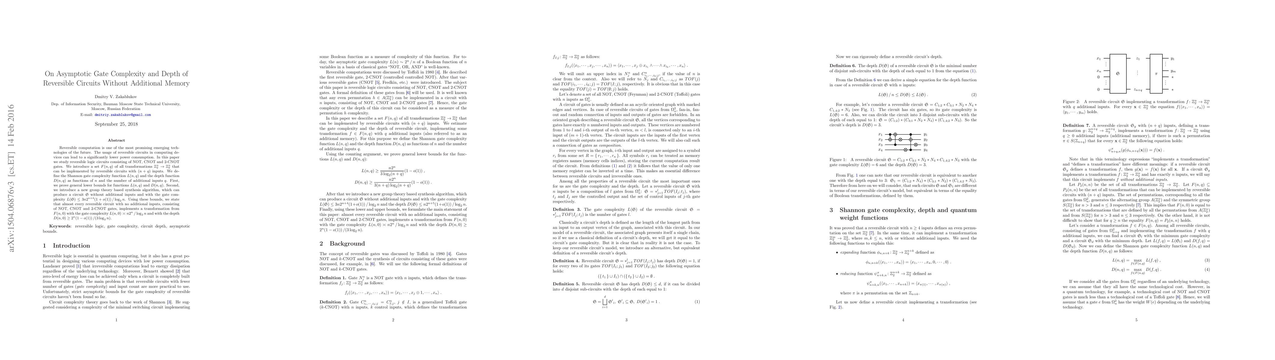 This paper investigates the asymptotic gate complexity and depth of reversible circuits without additional memory, focusing on NOT, CNOT, and 2-CNOT gates. It establishes lower bounds for gate complexity and depth functions and introduces a new synthesis algorithm achieving gate complexity $L(\mathfrak S) \leq 3n 2^{n+4}(1+o(1)) / \log_2 n$.