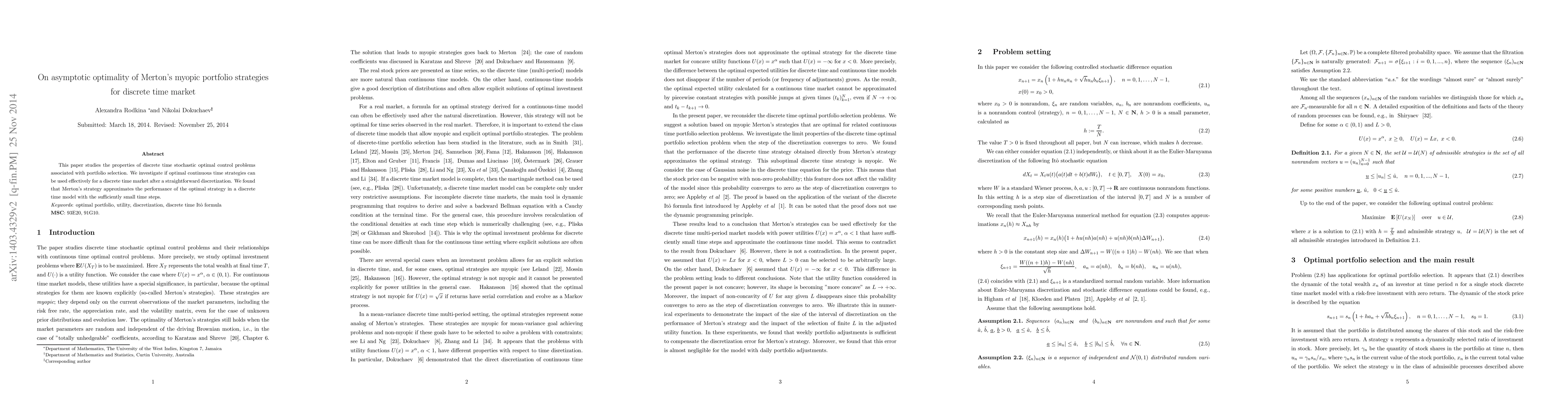 This paper examines the applicability of Merton's continuous time portfolio strategies in discrete time markets through discretization. It concludes that Merton's myopic strategy closely approximates the optimal discrete time portfolio performance when time steps are sufficiently small.