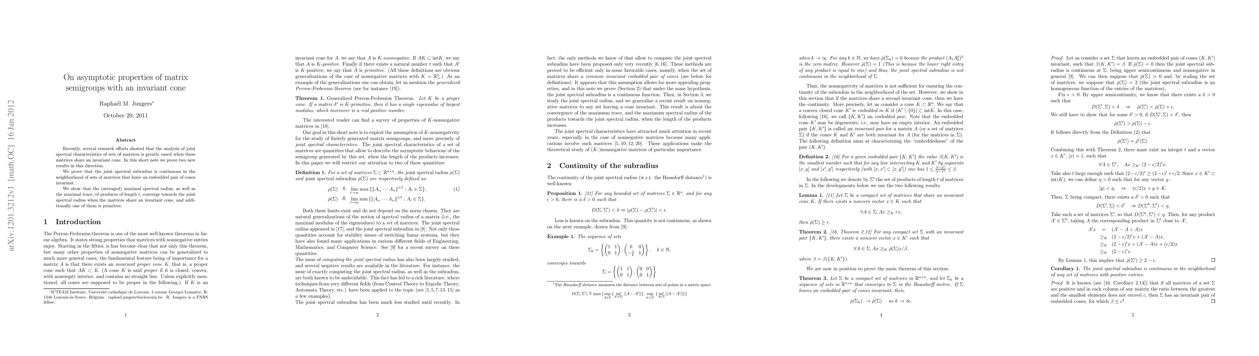 Recently, several research efforts showed that the analysis of joint spectral characteristics of sets of matrices is greatly eased when these matrices share an invariant cone. In this short note we prove two new results in this direction. We prove that the joint spectral subradius is continuous in the neighborhood of sets of matrices that leave an embedded pair of cones invariant. We show that the (averaged) maximal spectral radius, as well as the maximal trace, of products of length t, converge towards the joint spectral radius when the matrices share an invariant cone, and addi- tionally one of them is primitive.