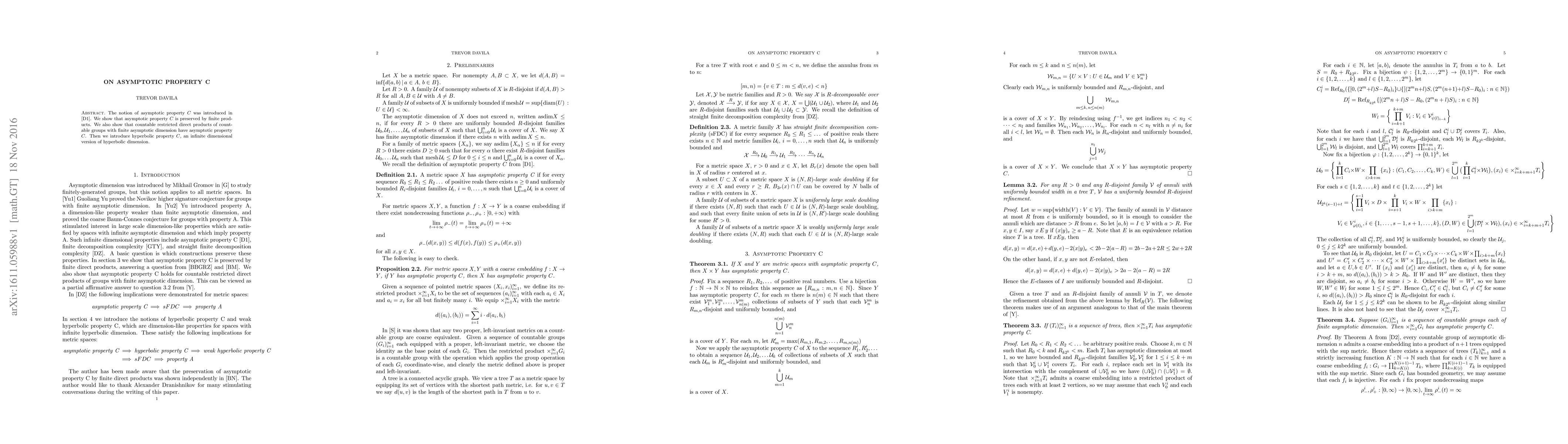 Asymptotic property C was introduced by Dranishnikov to study spaces with infinite asymptotic dimension. We show that asymptotic property C is preserved by infinite products. We also show that countable restricted direct products of countable groups with finite asymptotic dimension have asymptotic property C. Then we introduce hyperbolic property C, an infinite dimensional version of hyperbolic dimension.
