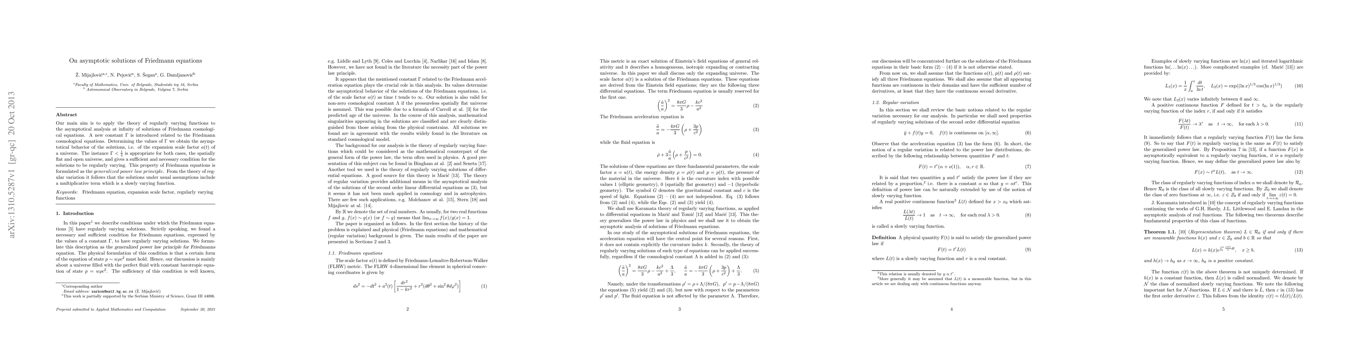 Our main aim is to apply the theory of regularly varying functions to the asymptotical analysis at infinity of solutions of Friedmann cosmological equations. A new constant $\Gamma$ is introduced related to the Friedmann cosmological equations. Determining the values of $\Gamma$ we obtain the asymptotical behavior of the solutions, i.e. of the expansion scale factor $a(t)$ of a universe. The instance $\Gamma < 1/4$ is appropriate for both cases, the spatially flat and open universe, and gives a sufficient and necessary condition for the solutions to be regularly varying. This property of Friedmann equations is formulated as the generalized power law principle. From the theory of regular variation it follows that the solutions under usual assumptions include a multiplicative term which is a slowly varying function.