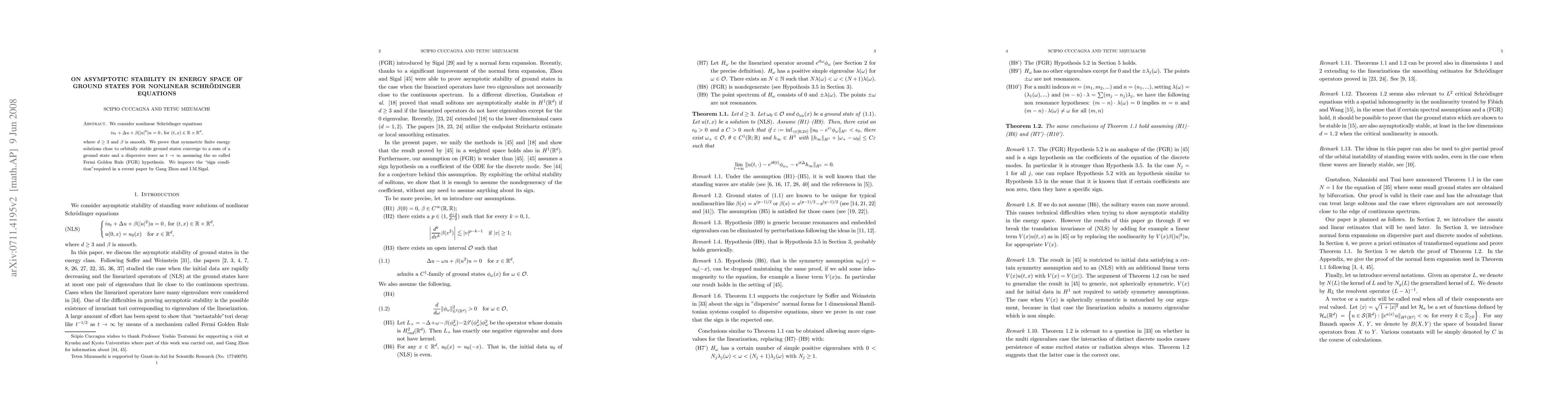 We consider nonlinear Schr\"odinger equations in dimension 3 or higher. We prove that symmetric finite energy solutions close to orbitally stable ground states converge asymptotically to a sum of a ground state and a dispersive wave assuming the so called Fermi Golden Rule (FGR) hypothesis. We improve the sign condition required in a recent paper by Gang Zhou and I.M.Sigal