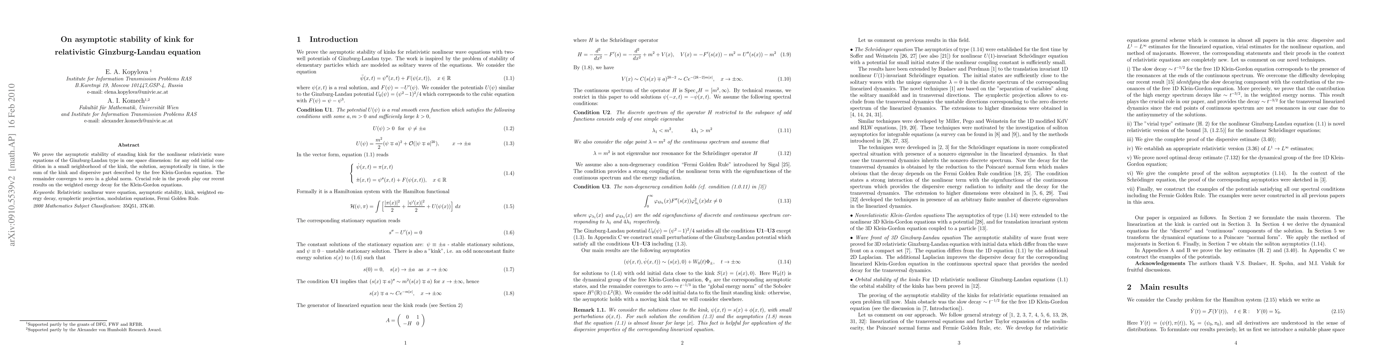 We prove the asymptotic stability of standing kink for the nonlinear relativistic wave equations of the Ginzburg-Landau type in one space dimension: for any odd initial condition in a small neighborhood of the kink, the solution, asymptotically in time, is the sum of the kink and dispersive part described by the free Klein-Gordon equation. The remainder converges to zero in a global norm. Crucial role in the proofs play our recent results on the weighted energy decay for the Klein-Gordon equations.