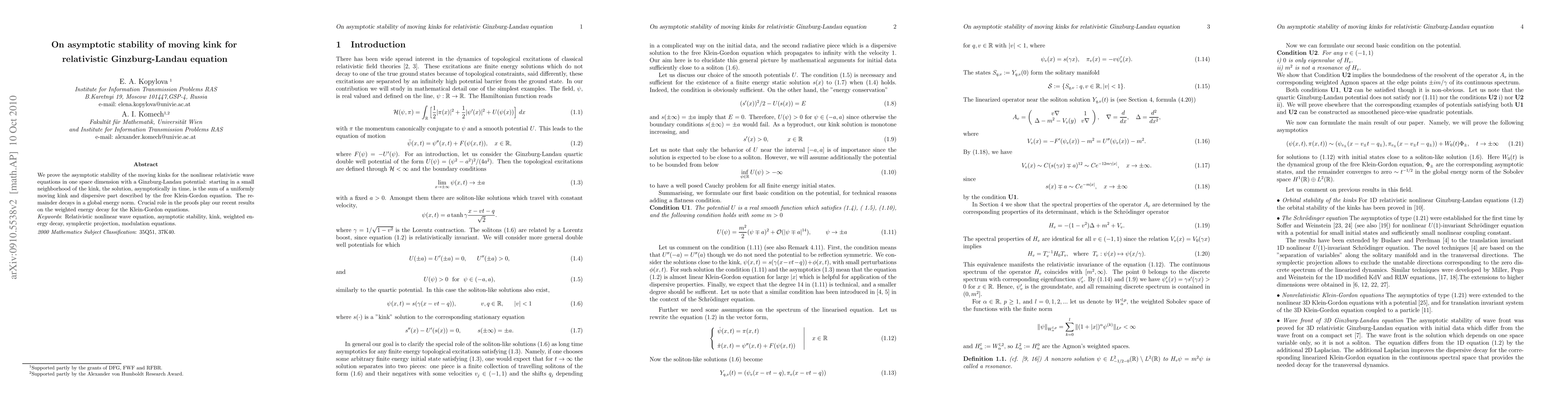 We prove the asymptotic stability of the moving kinks for the nonlinear relativistic wave equations in one space dimension with a Ginzburg-Landau potential: starting in a small neighborhood of the kink, the solution, asymptotically in time, is the sum of a uniformly moving kink and dispersive part described by the free Klein-Gordon equation. The remainder decays in a global energy norm. Crucial role in the proofs play our recent results on the weighted energy decay for the Klein-Gordon equations.