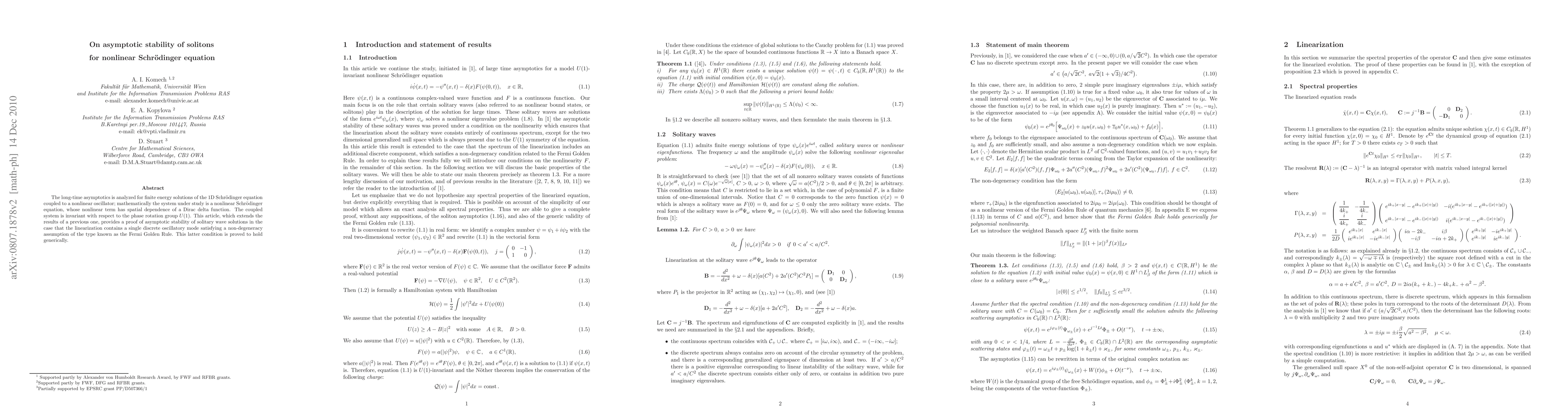 Researchers prove asymptotic stability of solitons for a nonlinear Schr"odinger equation coupled with a nonlinear oscillator, extending previous results under specific conditions.