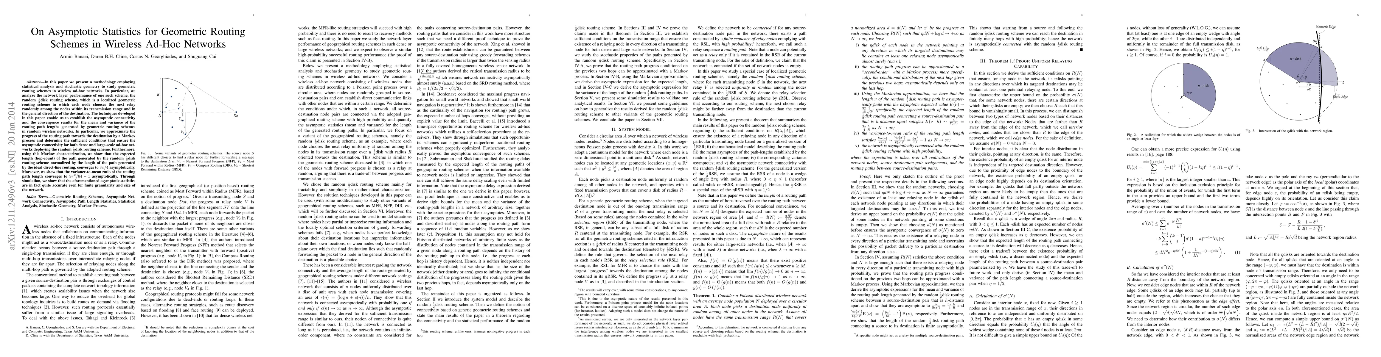 This paper employs statistical analysis and stochastic geometry to study the performance of geometric routing schemes in wireless ad-hoc networks, focusing on the random $\frac{1}{2}$disk routing scheme. It establishes asymptotic connectivity and convergence results for path lengths, showing that the expected hop-count converges to $3\pi/4$ and the variance-to-mean ratio converges to $9\pi^2/64-1$ as the network size increases.