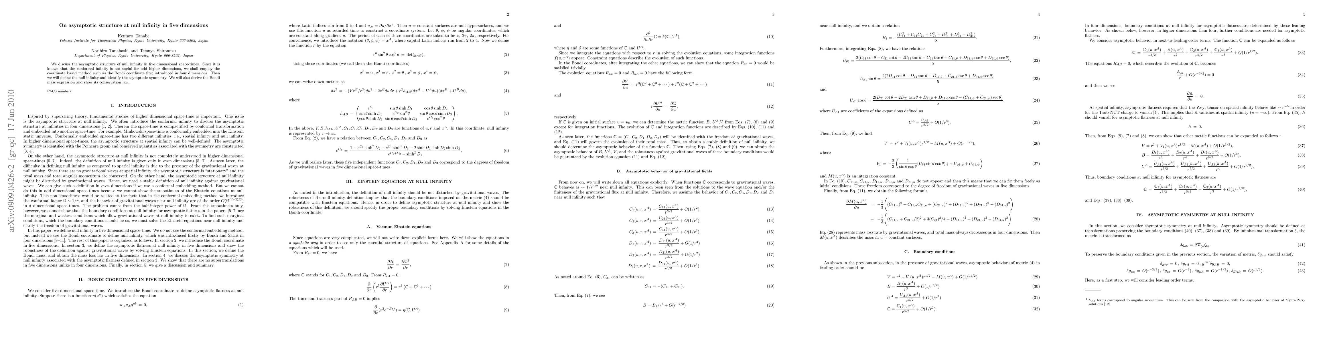 This paper explores the asymptotic structure of null infinity in five-dimensional space-time, utilizing the Bondi coordinate method to define null infinity and identify asymptotic symmetries. It derives the Bondi mass expression and demonstrates its conservation law.