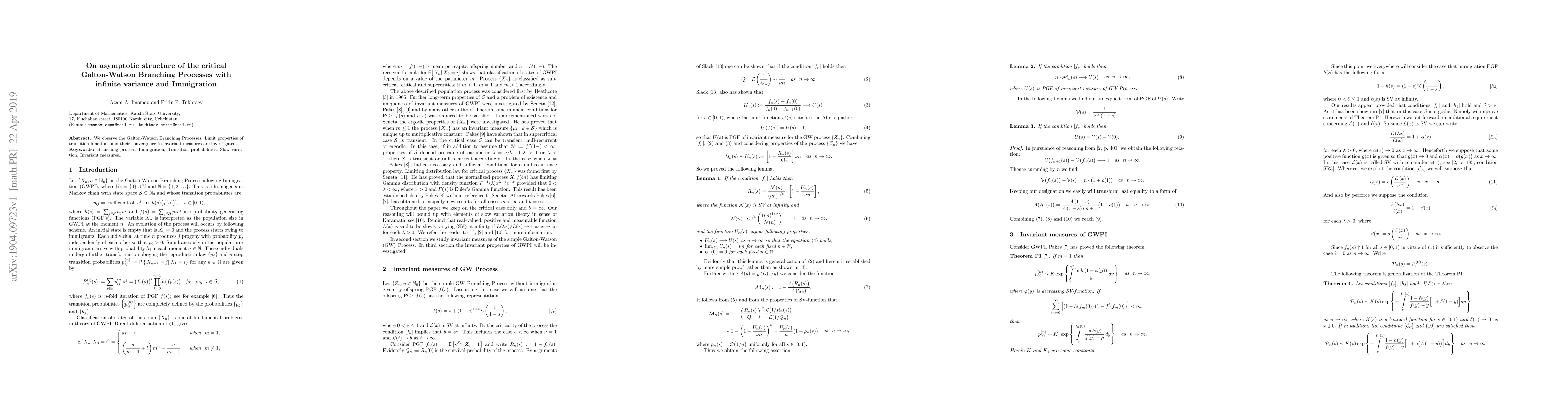 This paper investigates the asymptotic structure of critical Galton-Watson branching processes with infinite variance and immigration, focusing on limit properties of transition functions and their convergence to invariant measures.
