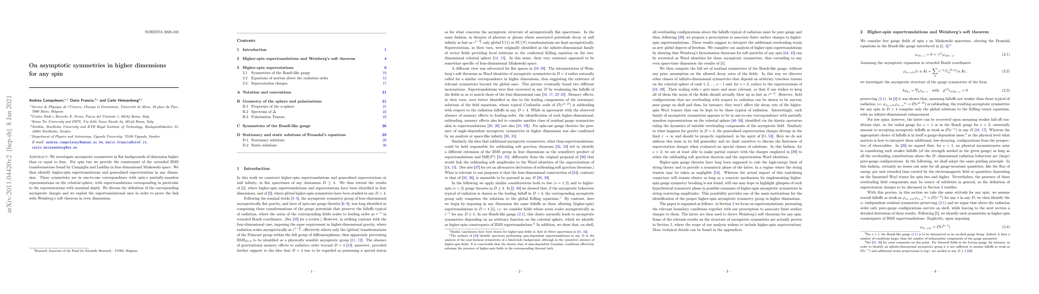 We investigate asymptotic symmetries in flat backgrounds of dimension higher than or equal to four. For spin two we provide the counterpart of the extended BMS transformations found by Campiglia and Laddha in four-dimensional Minkowski space. We then identify higher-spin supertranslations and generalised superrotations in any dimension. These symmetries are in one-to-one correspondence with spin-$s$ partially-massless representations on the celestial sphere, with supertranslations corresponding in particular to the representations with maximal depth. We discuss the definition of the corresponding asymptotic charges and we exploit the supertranslational ones in order to prove the link with Weinberg's soft theorem in even dimensions.