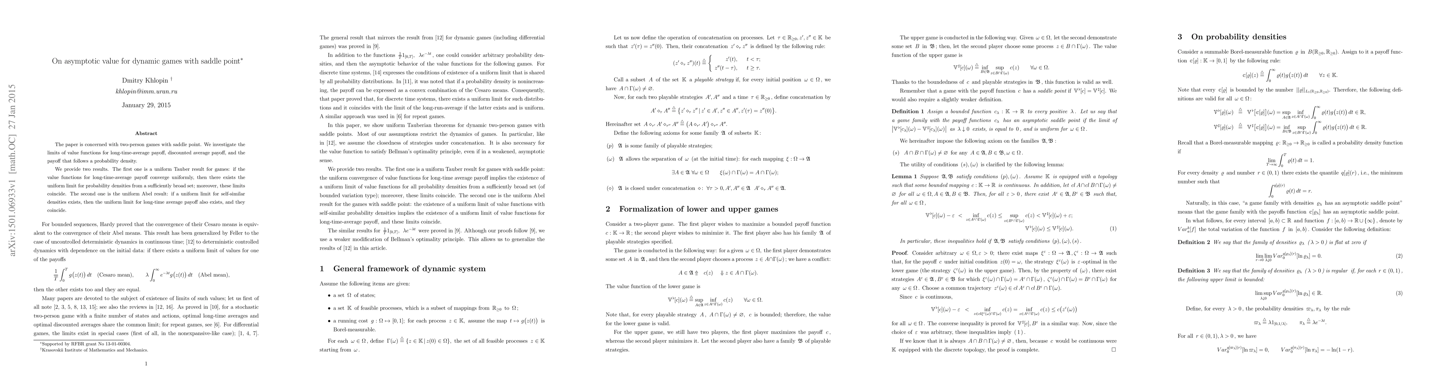The paper is concerned with two-person games with saddle point. We investigate the limits of value functions for long-time-average payoff, discounted average payoff, and the payoff that follows a probability density. Most of our assumptions restrict the dynamics of games. In particular, we assume the closedness of strategies under concatenation. It is also necessary for the value function to satisfy Bellman's optimality principle, even if in a weakened, asymptotic sense. We provide two results. The first one is a uniform Tauber result for games: if the value functions for long-time-average payoff converge uniformly, then there exists the uniform limit for probability densities from a sufficiently broad set; moreover, these limits coincide. The second one is the uniform Abel result: if a uniform limit for self-similar densities exists, then the uniform limit for long-time average payoff also exists, and they coincide.