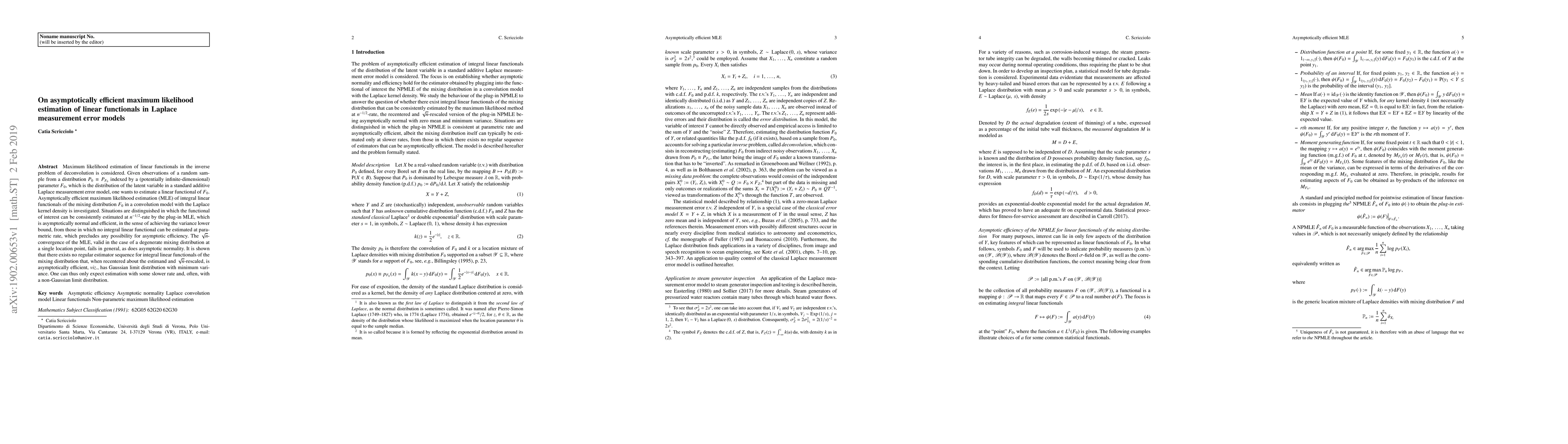 This paper investigates asymptotically efficient maximum likelihood estimation (MLE) for linear functionals in a Laplace measurement error model. It finds that while plug-in MLE can achieve $n^{-1/2}$-rate consistency in certain cases, it fails to provide efficient estimation at the $\sqrt{n}$-rate for general mixing distributions, often resulting in non-Gaussian limit distributions.