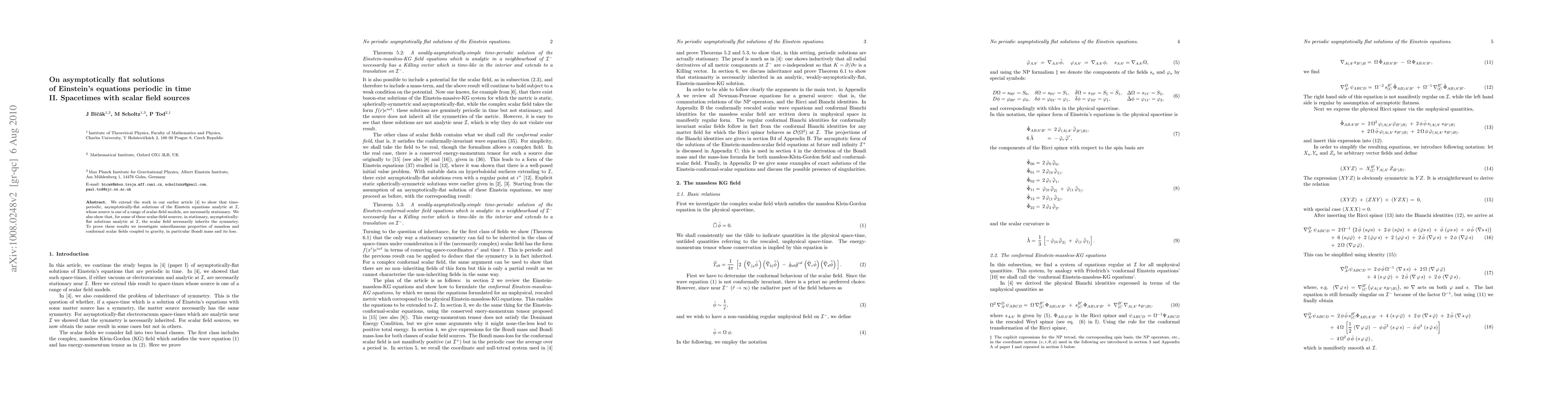 This paper extends previous work to demonstrate that time-periodic, asymptotically-flat solutions of Einstein's equations, sourced by certain scalar-field models, are necessarily stationary. The study also shows that some scalar fields in these stationary solutions inherit the symmetry, and it investigates properties of massless and conformal scalar fields coupled with gravity, focusing on Bondi mass and its loss.