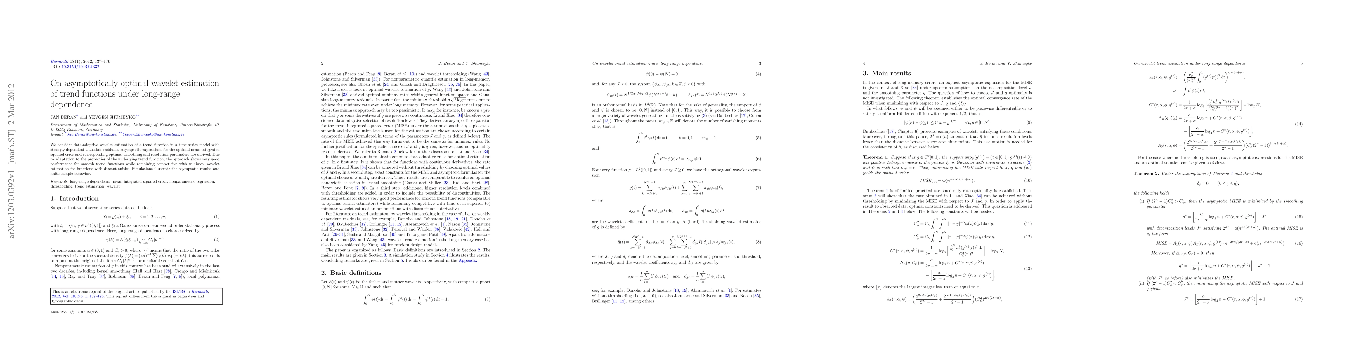 This paper develops an adaptive wavelet estimation method for trend functions in time series with long-range dependent Gaussian residuals, deriving optimal parameters for minimizing mean integrated squared error. The method performs well for smooth trends and remains competitive for discontinuous functions, as demonstrated by simulations.