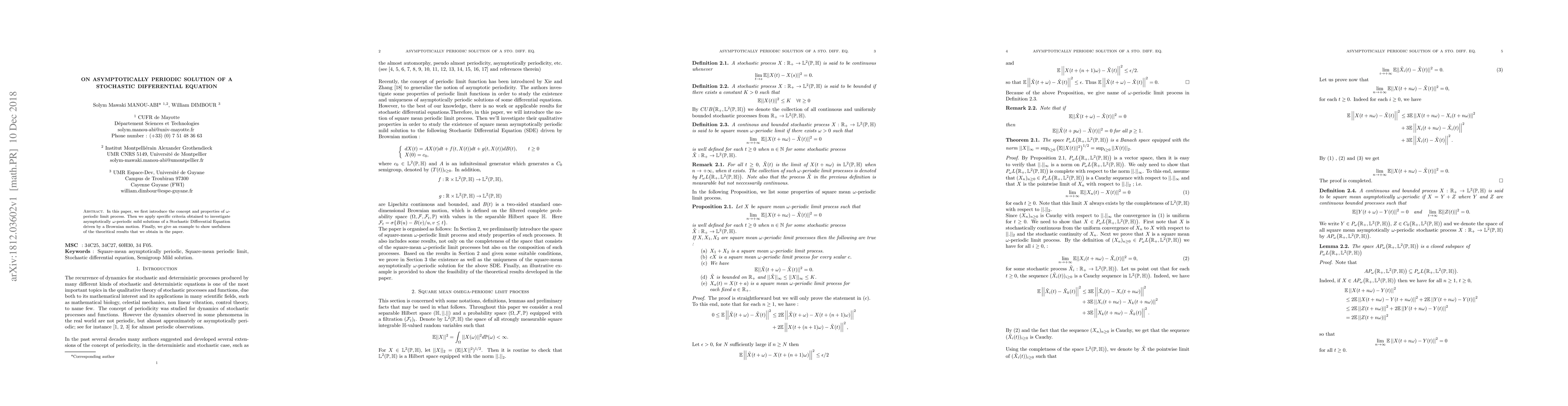 In this paper, we first introduce the concept and properties of {\omega}- periodic limit process. Then we apply specific criteria obtained to investigate asymptotically {\omega}-periodic mild solutions of a Stochastic Differential Equation driven by a Brownian motion. Finally, we give an example to show usefulness of the theoritical results that we obtain in the paper.