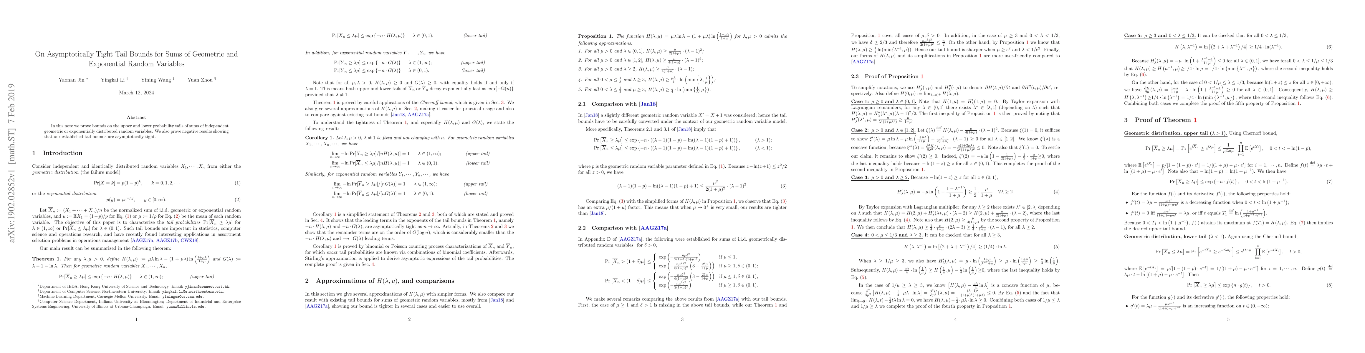 This paper provides asymptotically tight tail bounds for the sums of independent geometric or exponential random variables, demonstrating both upper and lower probability tails, and proves that these bounds are optimal through negative results.