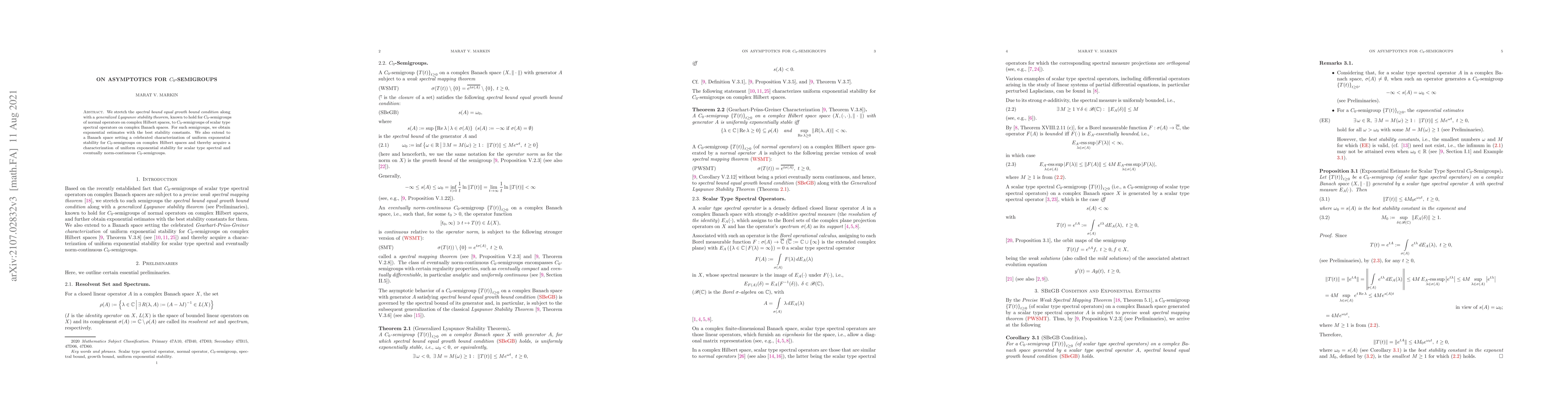 We stretch the spectral bound equal growth bound condition along with a generalized Lyapunov stability theorem, known to hold for $C_0$-semigroups of normal operators on complex Hilbert spaces, to $C_0$-semigroups of scalar type spectral operators on complex Banach spaces. For such semigroups, we obtain exponential estimates with the best stability constants. We also extend to a Banach space setting a celebrated characterization of uniform exponential stability for $C_0$-semigroups on complex Hilbert spaces and thereby acquire a characterization of uniform exponential stability for scalar type spectral and eventually norm-continuous $C_0$-semigroups.