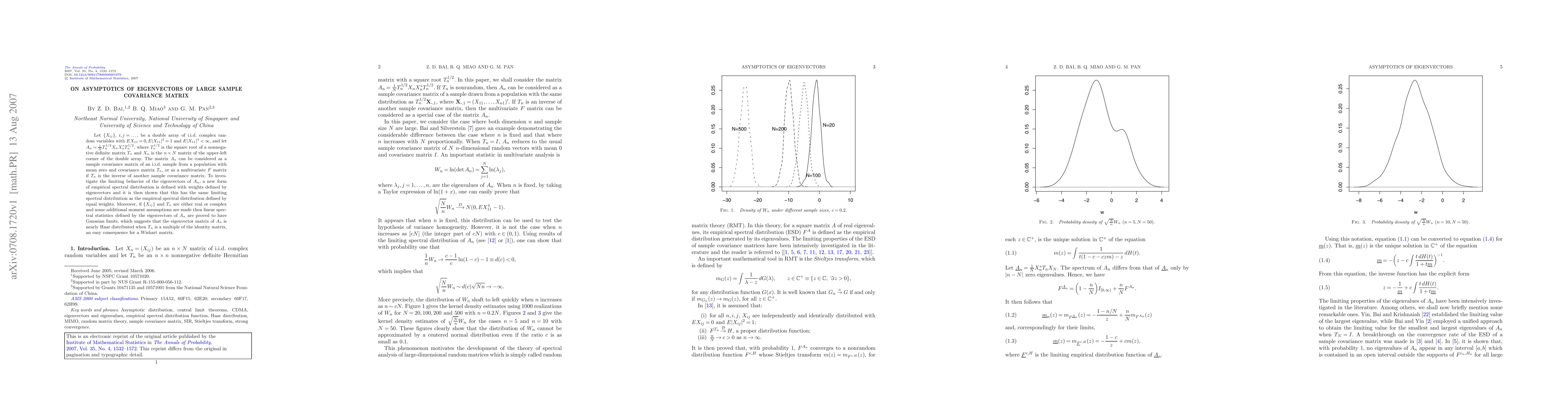 Let \{$X_{ij}$\}, $i,j=...,$ be a double array of i.i.d. complex random variables with $EX_{11}=0,E|X_{11}|^2=1$ and $E|X_{11}|^4<\infty$, and let $A_n=\frac{1}{N}T_n^{{1}/{2}}X_nX_n^*T_n^{{1}/{2}}$, where $T_n^{{1}/{2}}$ is the square root of a nonnegative definite matrix $T_n$ and $X_n$ is the $n\times N$ matrix of the upper-left corner of the double array. The matrix $A_n$ can be considered as a sample covariance matrix of an i.i.d. sample from a population with mean zero and covariance matrix $T_n$, or as a multivariate $F$ matrix if $T_n$ is the inverse of another sample covariance matrix. To investigate the limiting behavior of the eigenvectors of $A_n$, a new form of empirical spectral distribution is defined with weights defined by eigenvectors and it is then shown that this has the same limiting spectral distribution as the empirical spectral distribution defined by equal weights. Moreover, if \{$X_{ij}$\} and $T_n$ are either real or complex and some additional moment assumptions are made then linear spectral statistics defined by the eigenvectors of $A_n$ are proved to have Gaussian limits, which suggests that the eigenvector matrix of $A_n$ is nearly Haar distributed when $T_n$ is a multiple of the identity matrix, an easy consequence for a Wishart matrix.