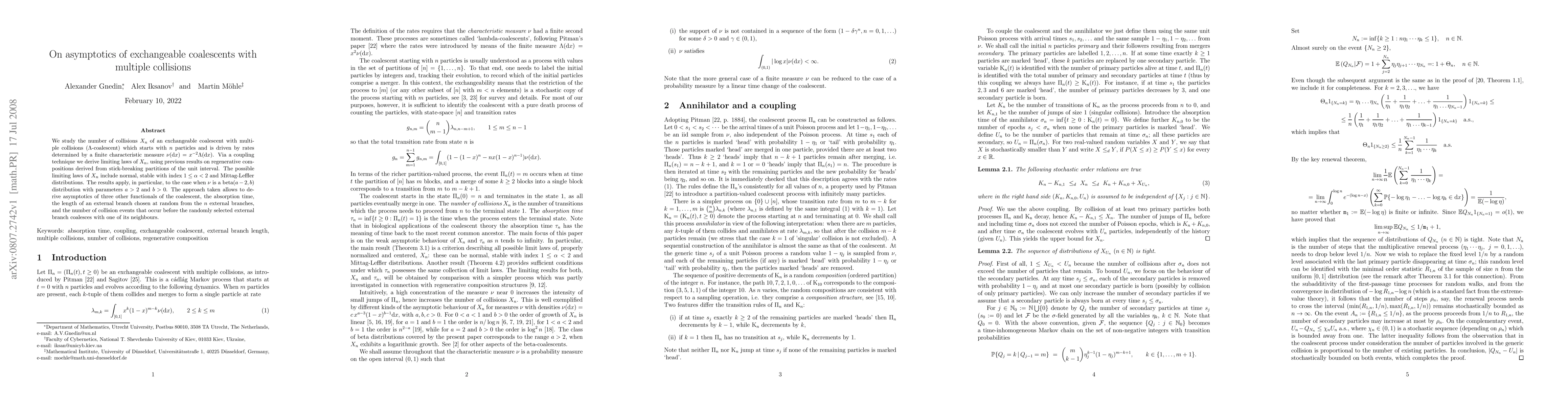 This paper investigates the asymptotic behavior of collisions in an exchangeable coalescent with multiple collisions, deriving limiting laws for the number of collisions via a coupling technique. The study identifies possible limiting distributions including normal, stable, and Mittag-Leffler distributions, with particular focus on the beta distribution case.