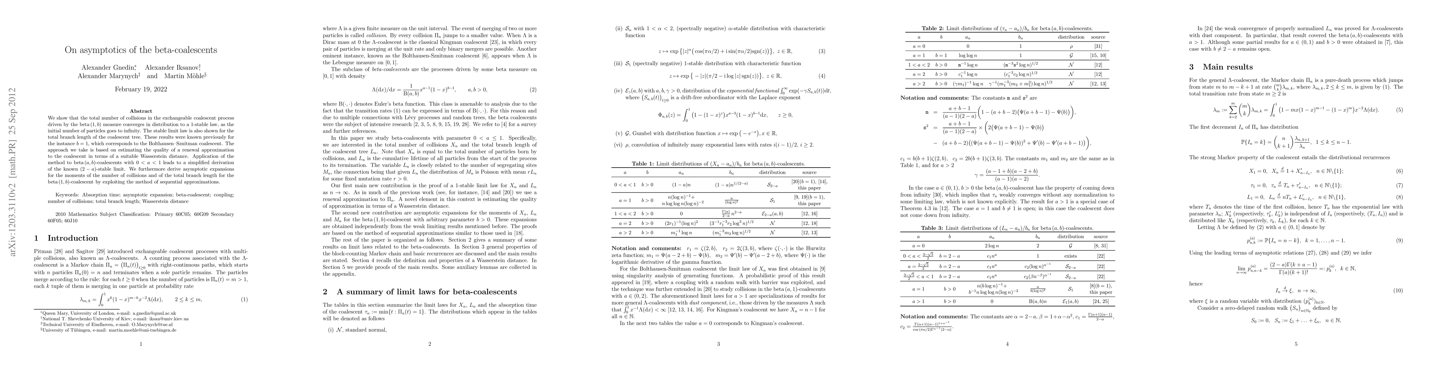 Researchers study the asymptotic behavior of beta-coalescents, finding that their collision counts converge to a 1-stable law as the number of particles increases, and derive expansions for key statistics.