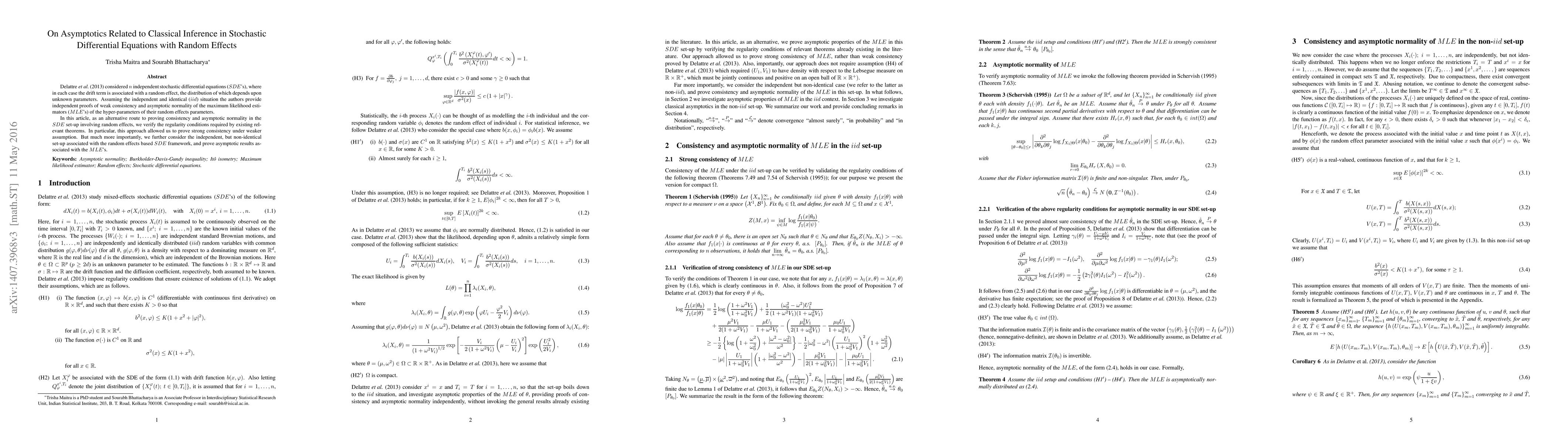 Delattre et al. (2013) considered n independent stochastic differential equations (SDEs), where in each case the drift term is associated with a random effect, the distribution of which depends upon unknown parameters. Assuming the independent and identical (iid) situation the authors provide independent proofs of weak consistency and asymptotic normality of the maximum likelihood estimators (MLEs) of the hyper-parameters of their random effects parameters. In this article, as an alternative route to proving consistency and asymptotic normality in the SDE set-up involving random effects, we verify the regularity conditions required by existing relevant theorems. In particular, this approach allowed us to prove strong consistency under weaker assumption. But much more importantly, we further consider the independent, but non-identical set-up associated with the random effects based SDE framework, and prove asymptotic results associated with the MLEs.